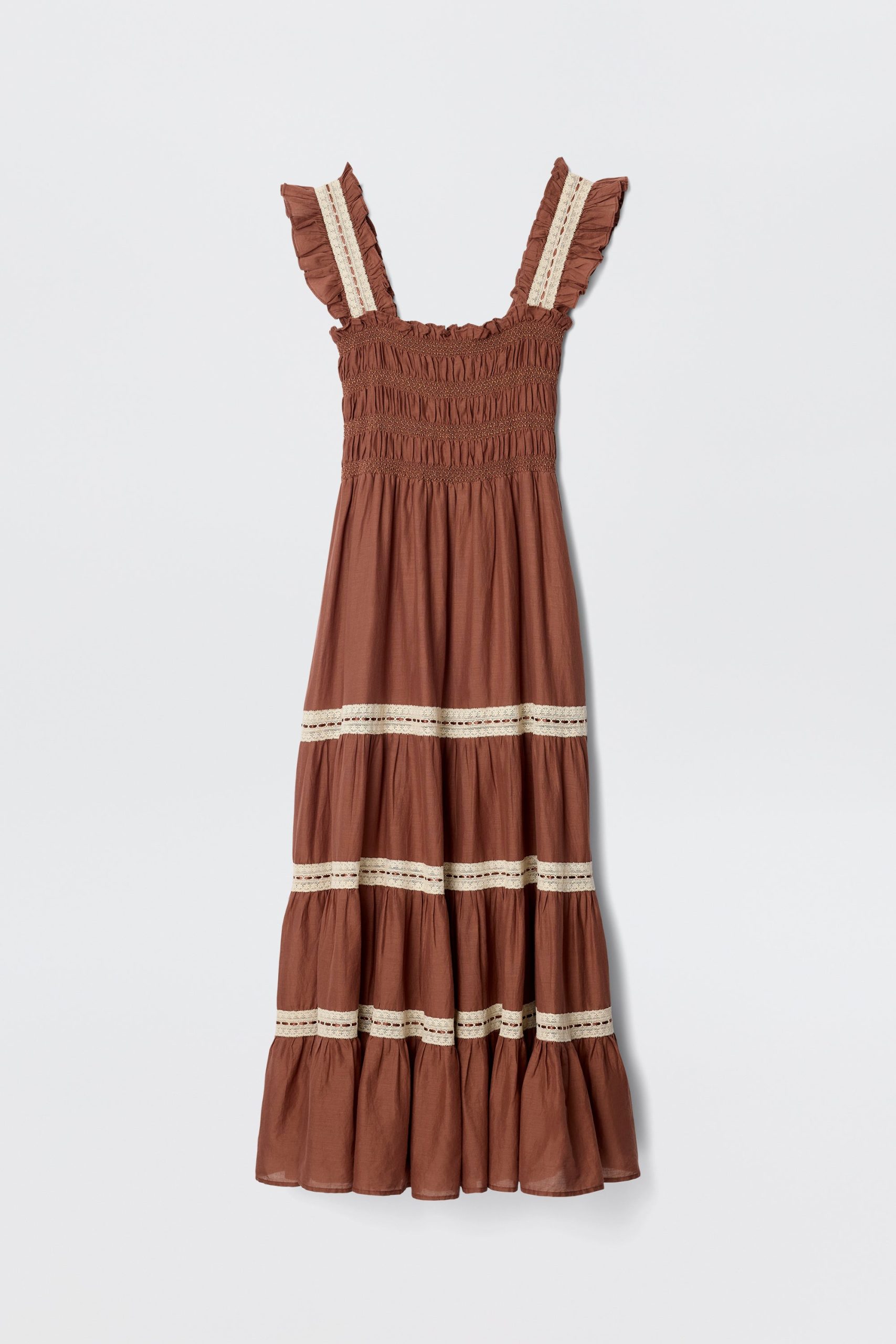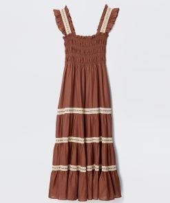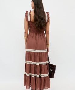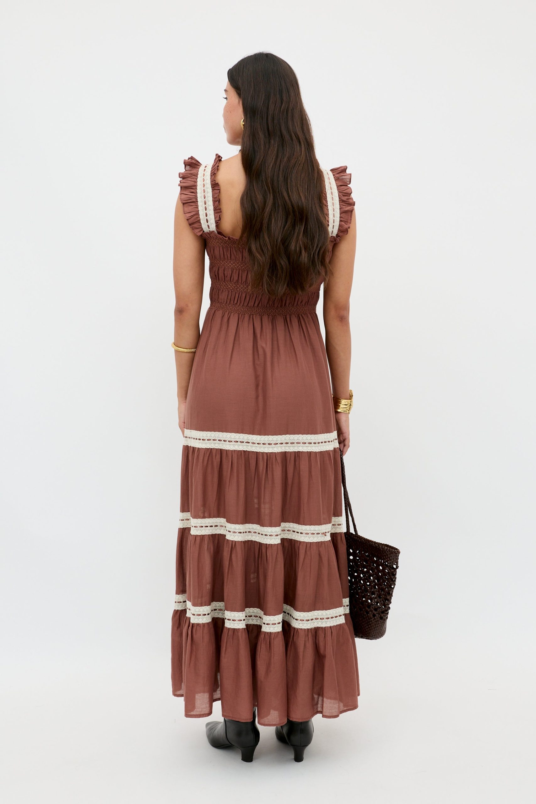 Product detailsDetailsOur beloved Aubrie dress — now available in vintage-inspired brown. Our take on a 1970s nightdress, this breezy, lace crochet-detailed midi can be styled for evening sojourns or worn effortlessly in the day. Wear yours with our Milani Raffia Bag.Fit