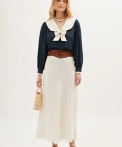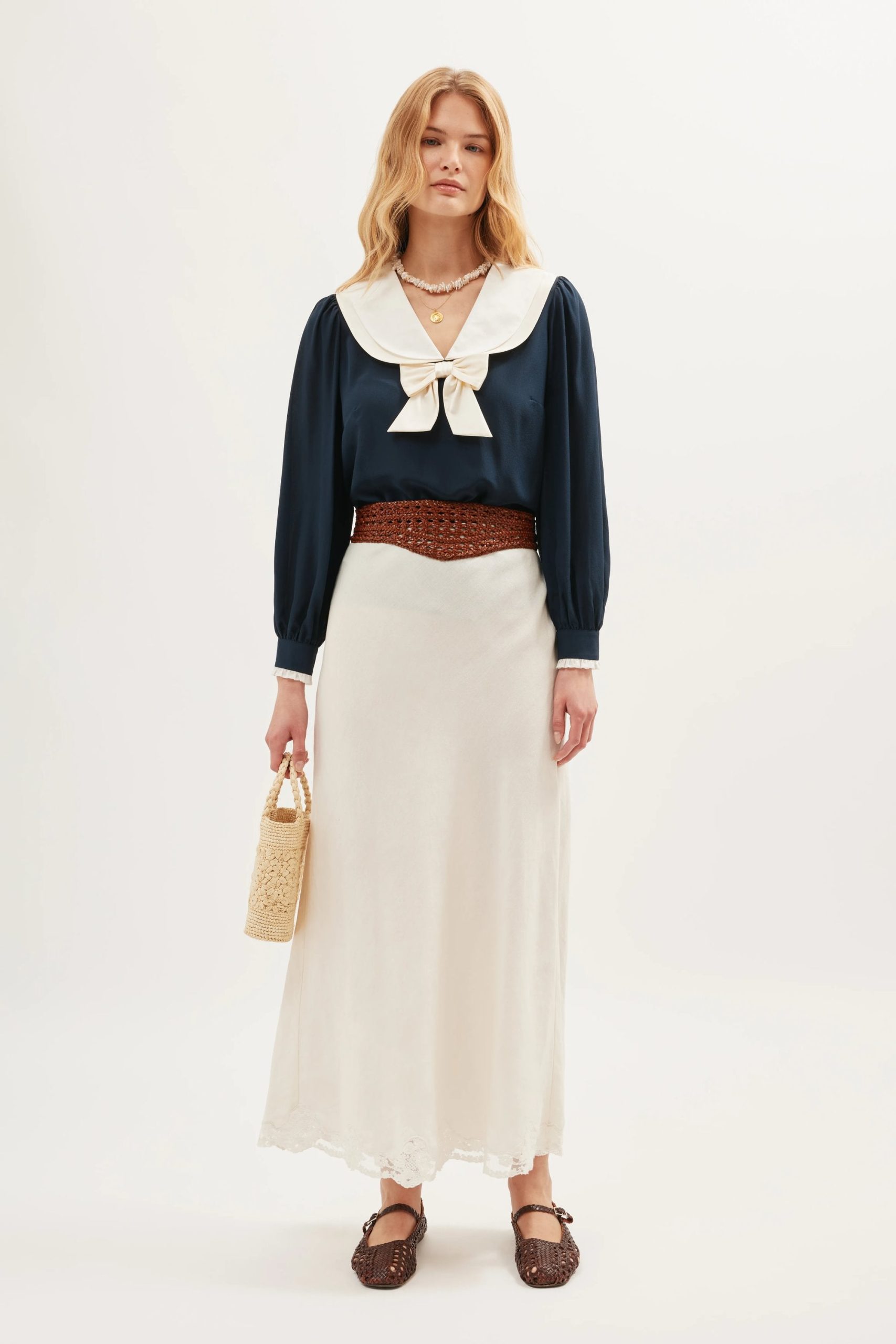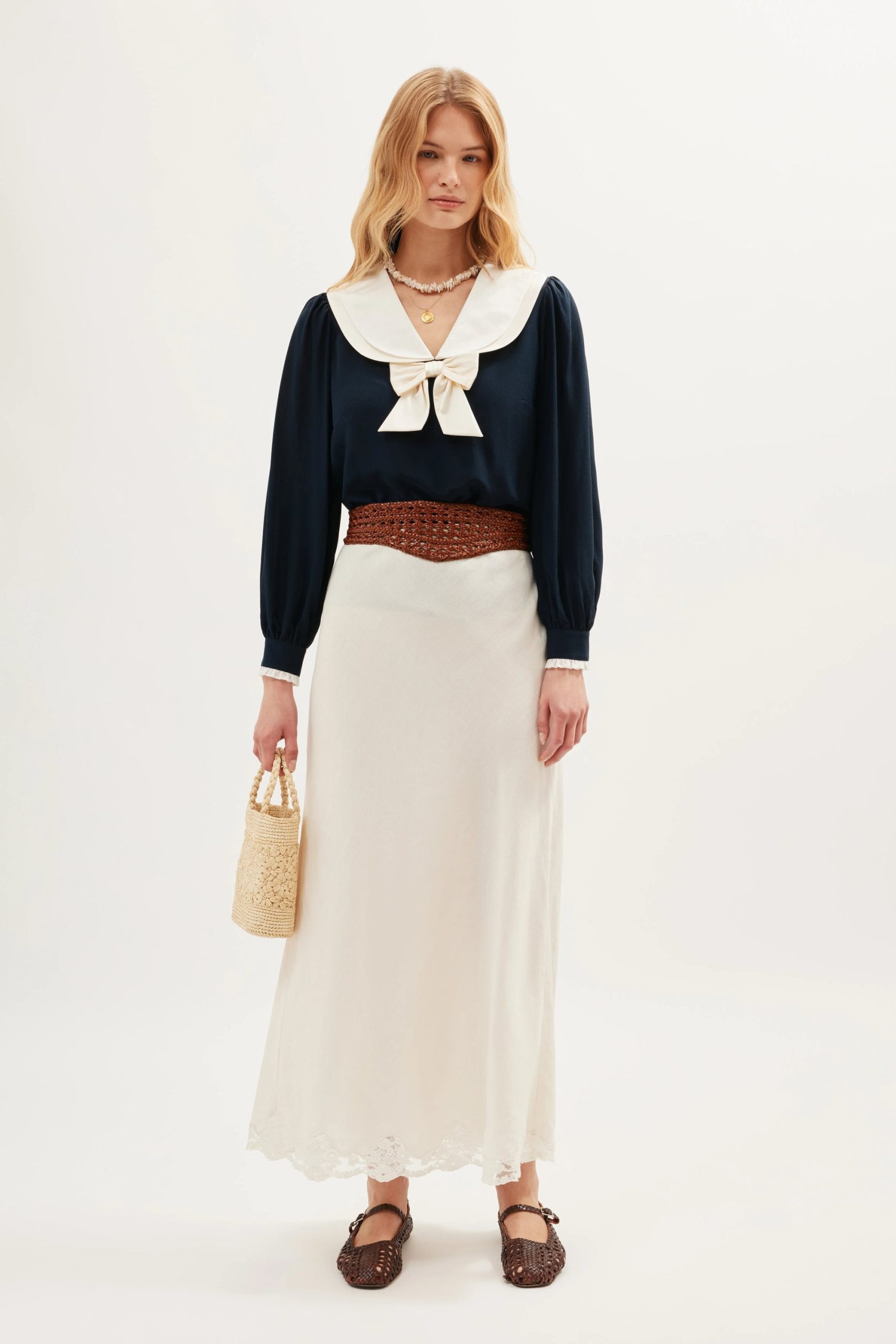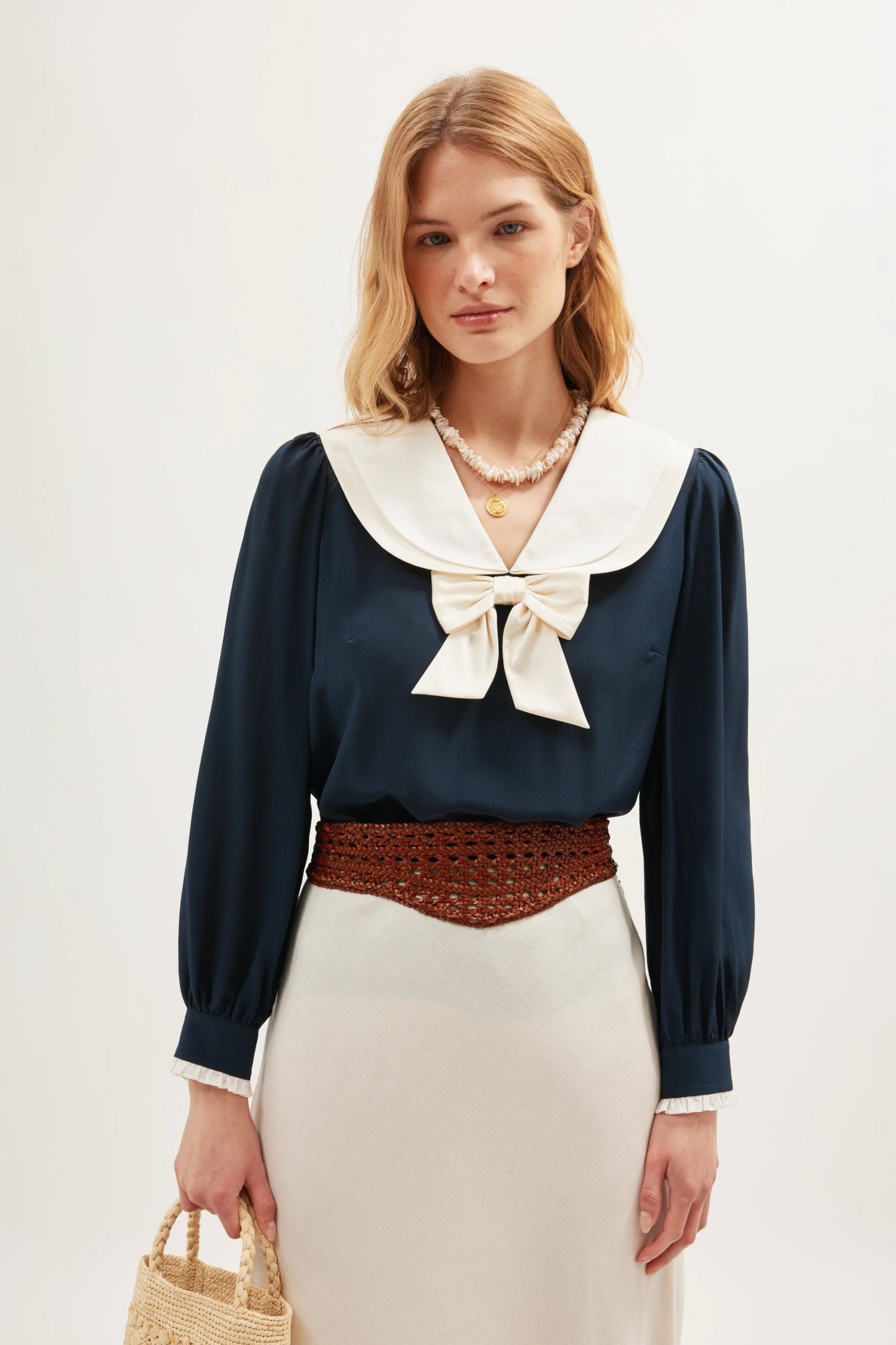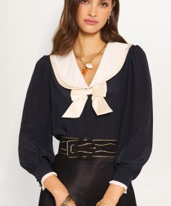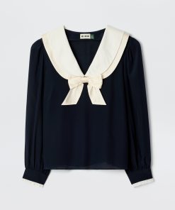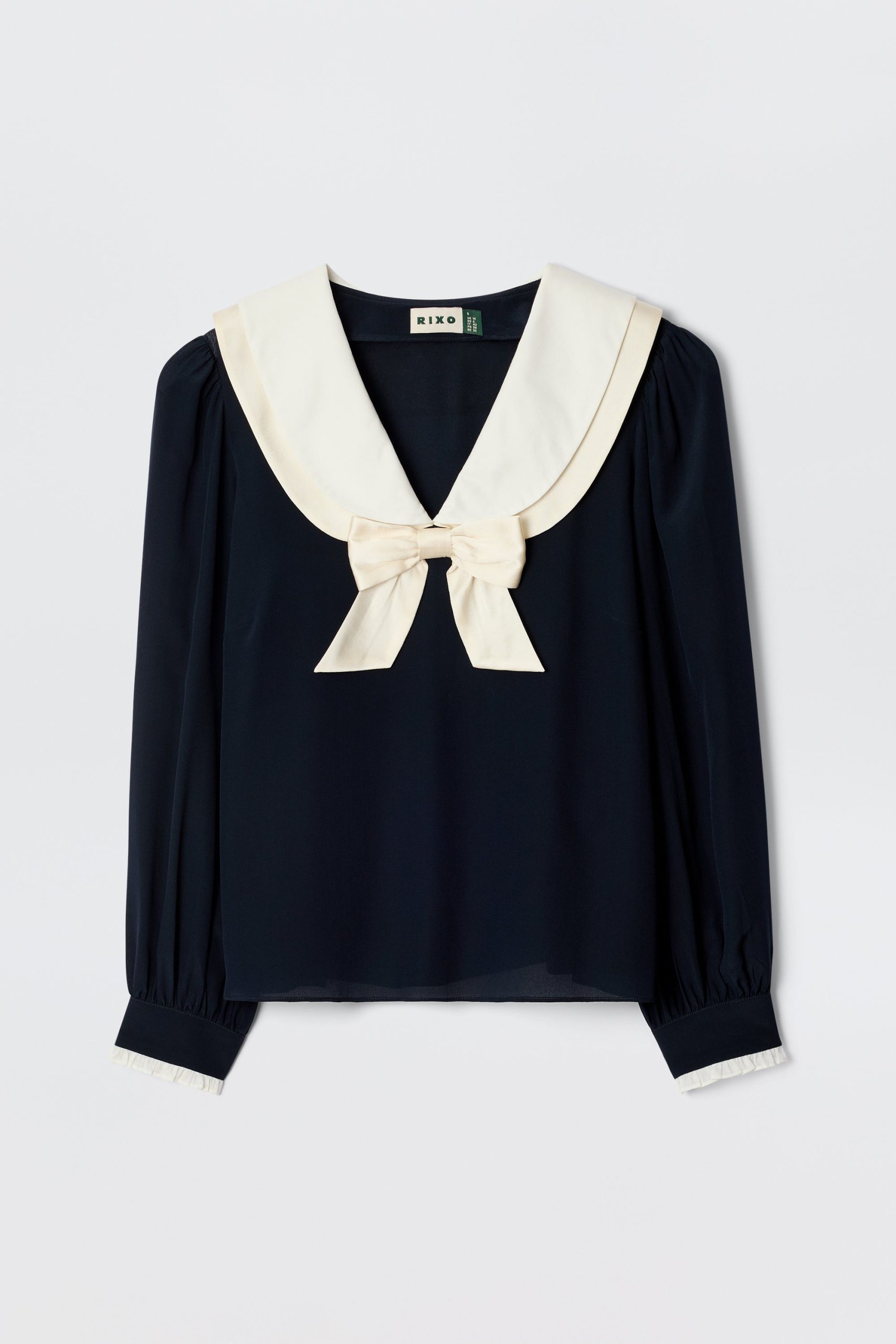 Product detailsDetailsThis silk crepe de chine Eimer top is nautical inspired, with a sailor-style collar made from layers of cotton and silk-satin. The blouson sleeves are trimmed with ladylike frilled cuffs and the A-line body works tucked or untucked.Fit