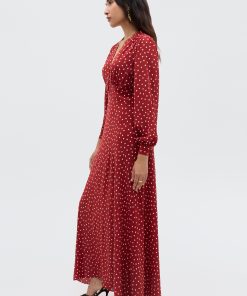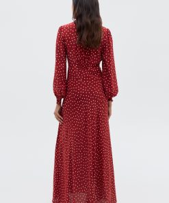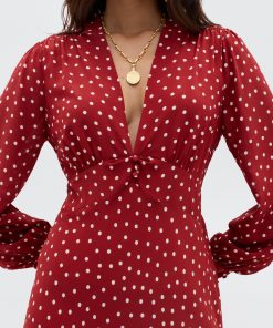 Product detailsDetailsFeminine and refined. Discover RIXO’s iconic Emory gown, patterned with classic polka dots in a bombshell red. Crafted from luxurious silk it feels extra special. The deep V-neck, nipped in waistband and long blouson sleeves make it a timeless choice. Lightweight silk crepe de chine: elegant drapeFit