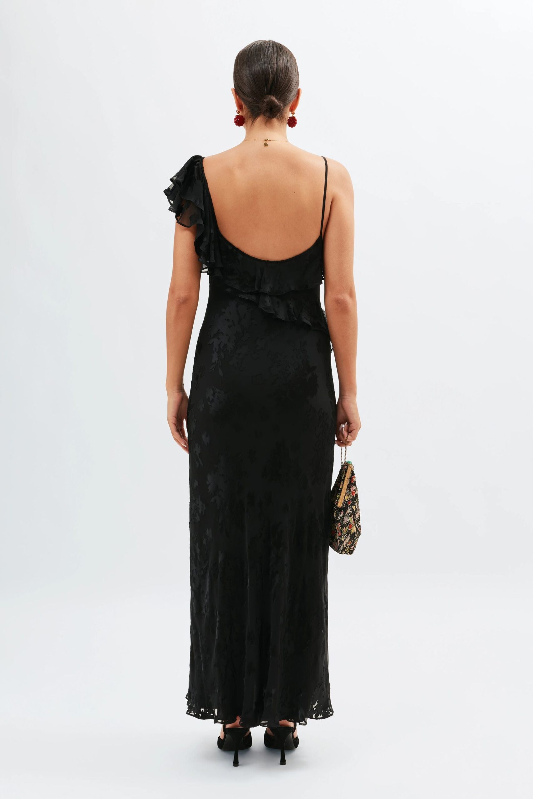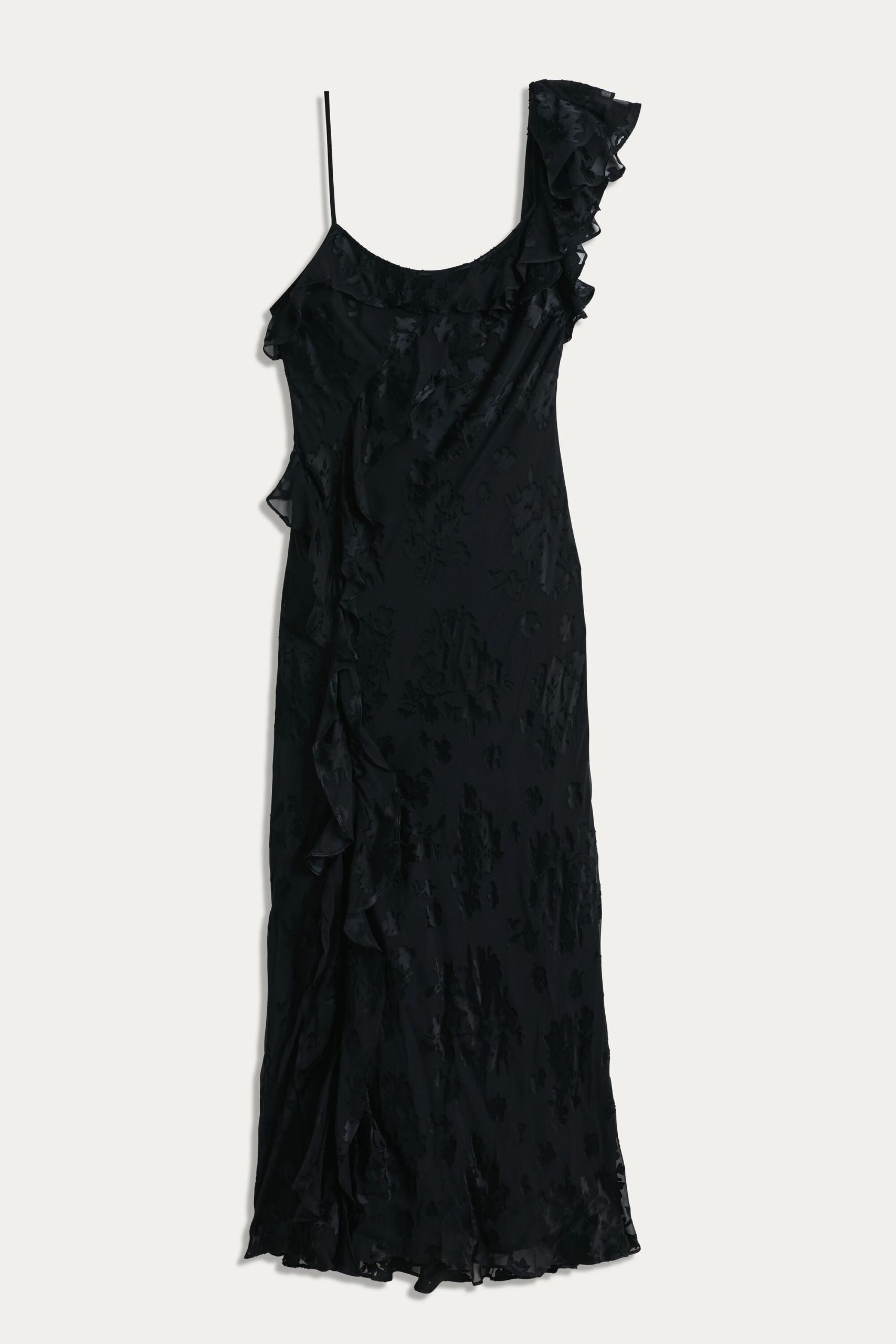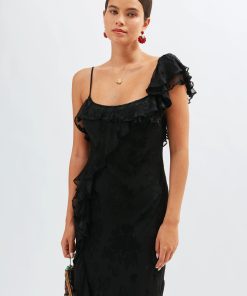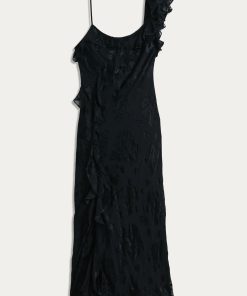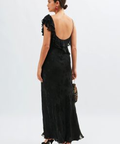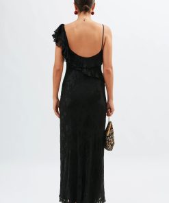 Product detailsDetailsInspired by ’90s slip styles, the black Ester is the ultimate statement evening dress. Its elegant drape, asymmetric necklace and romantic ruffles are perfect for all occasions, taking you from special dinner dates to black tie events.Fit