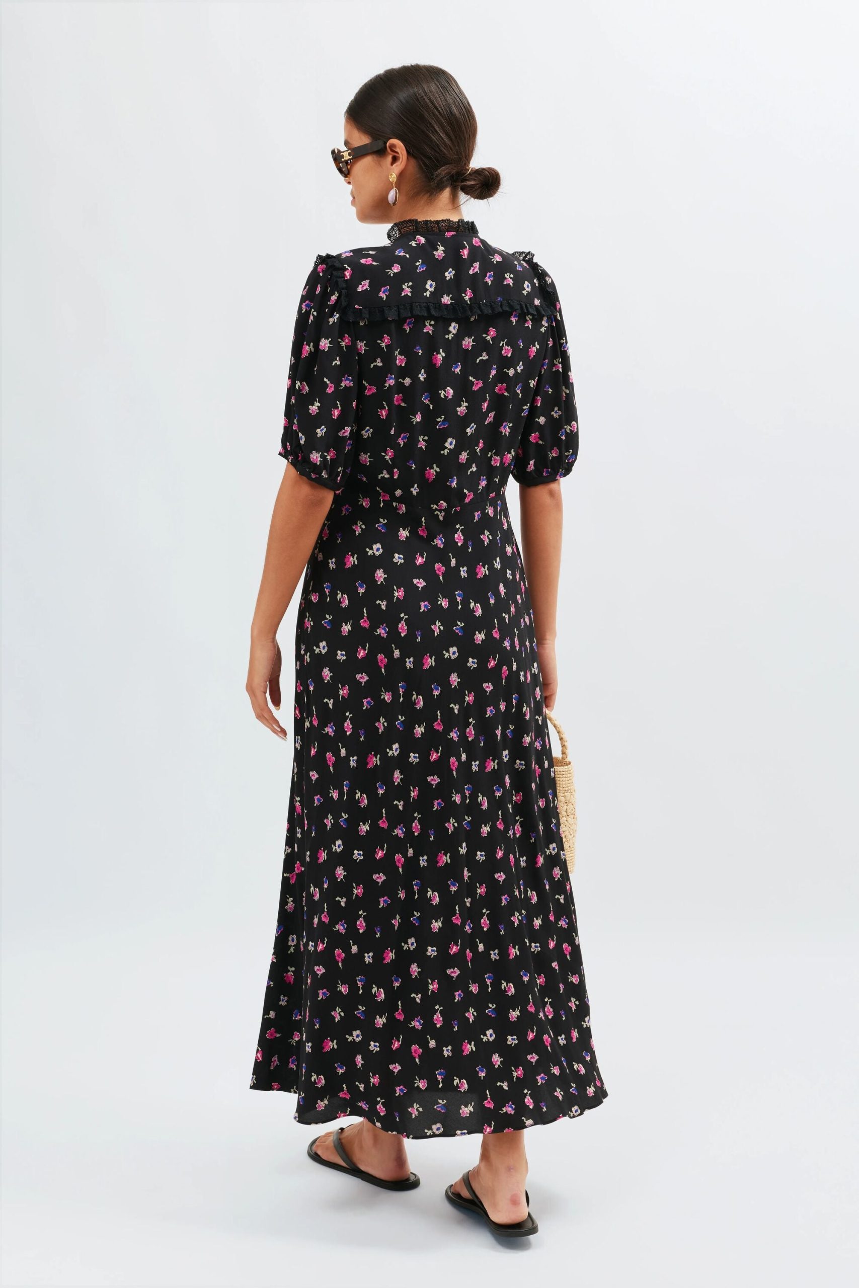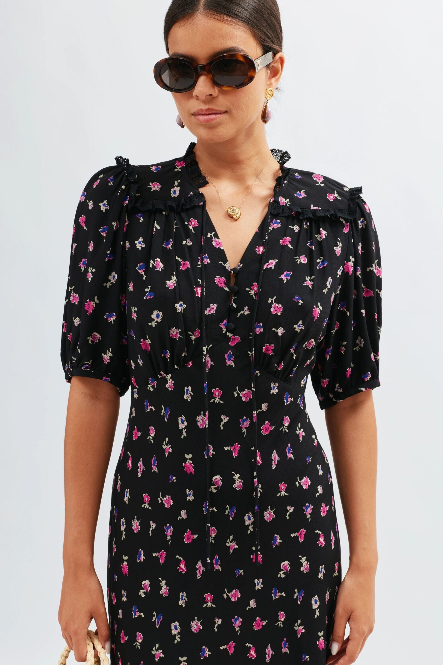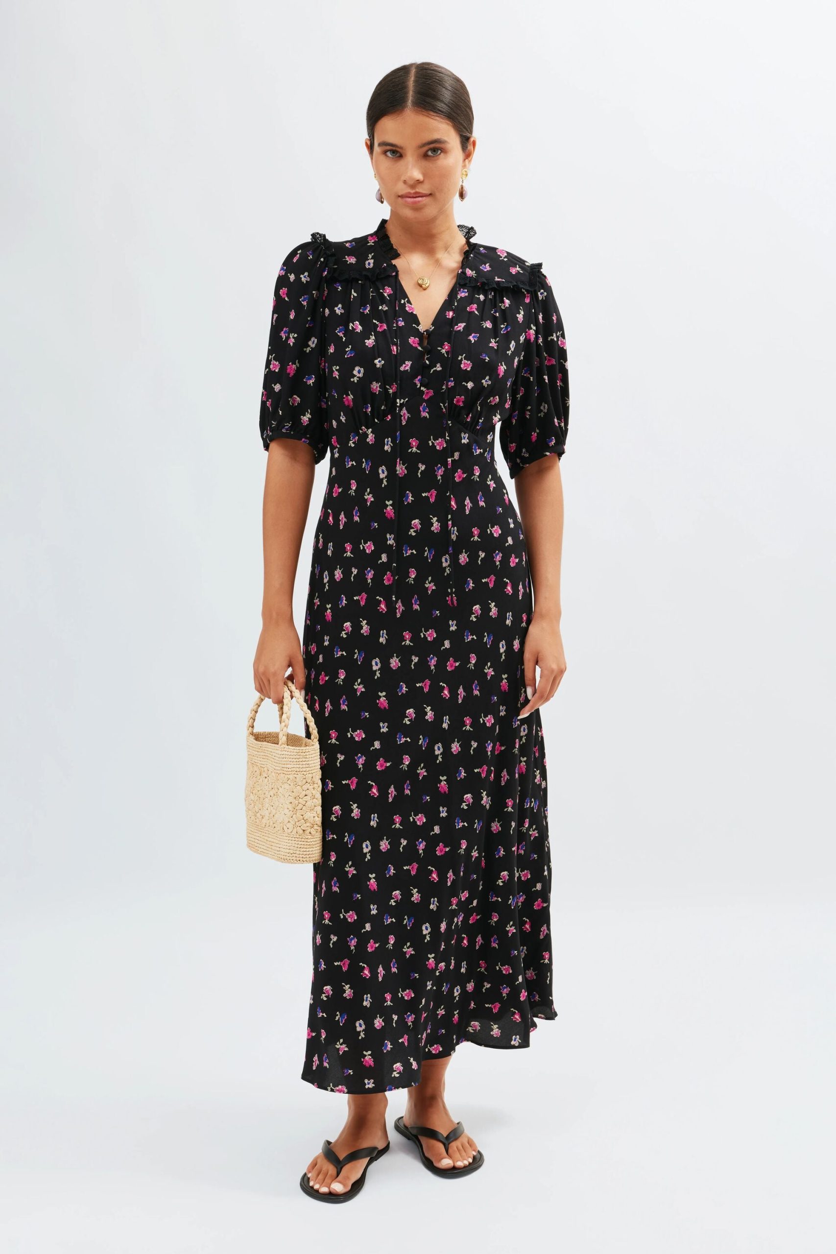 Product detailsDetailsOur new Gwen dress oozes everyday elegance. Featuring disty floral prints, inspired by vintage patterns — this is the ultimate day to night classic. Style yours with our beautiful gold-plated Taelia shell necklace.Fit