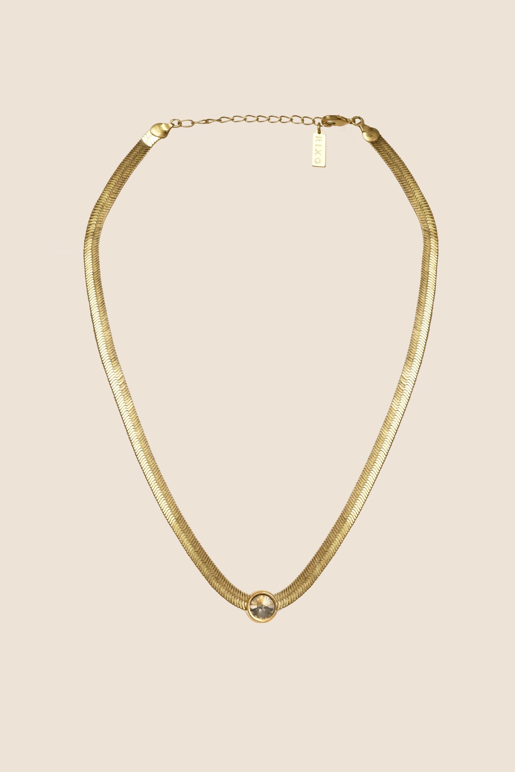 Product detailsDetailsWe love layering Innes with other necklaces because the smooth snake chain doesn’t get tangled. It’s made from gold-plated metal and threaded with a single glass crystal for subtle interest.Fit