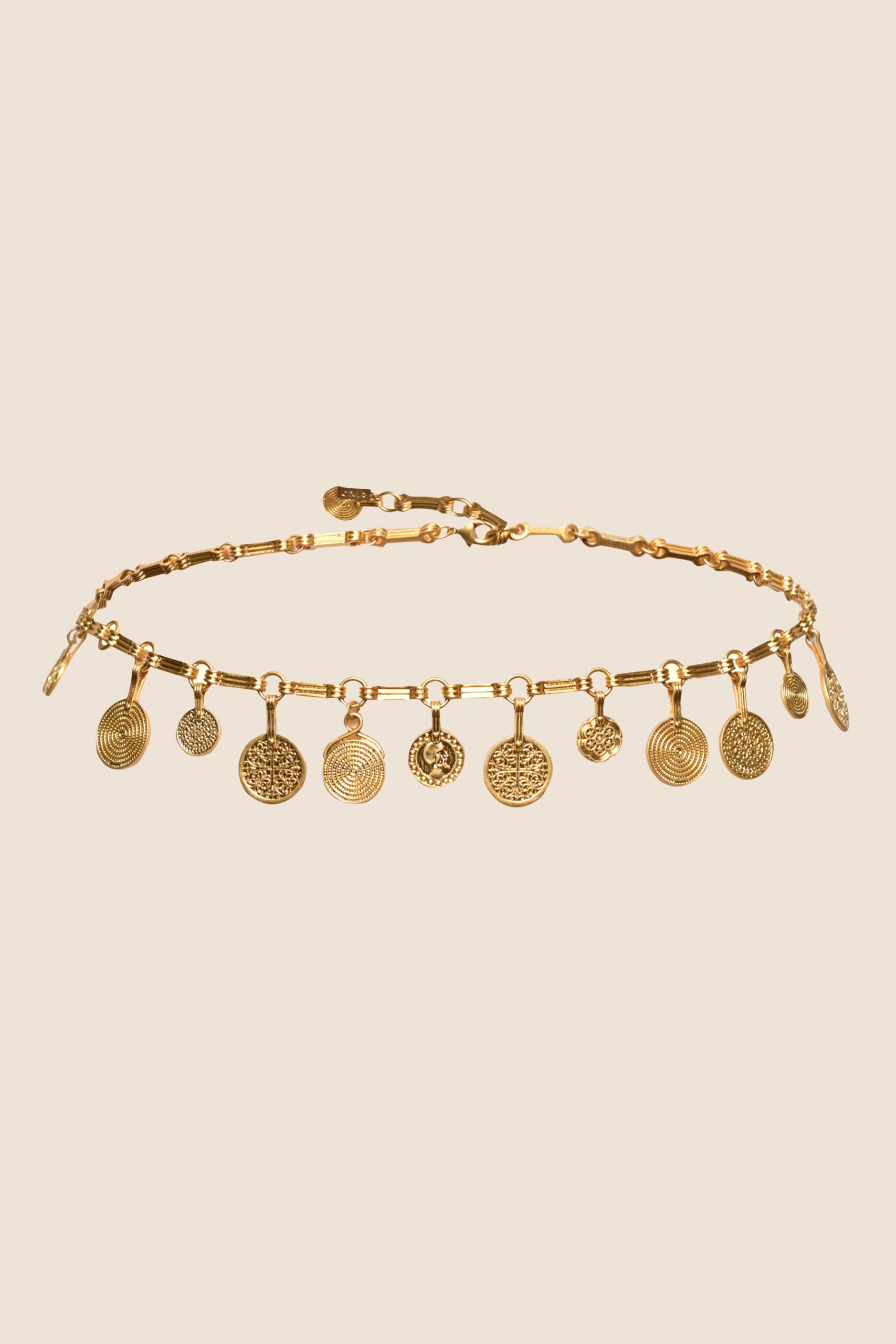 Product detailsDetailsThe Isolde belt brings a touch of vintage glamour to your favourite RIXO dresses. Each coin is detailed with exotic engravings, drawing the eye to your waist.Fit