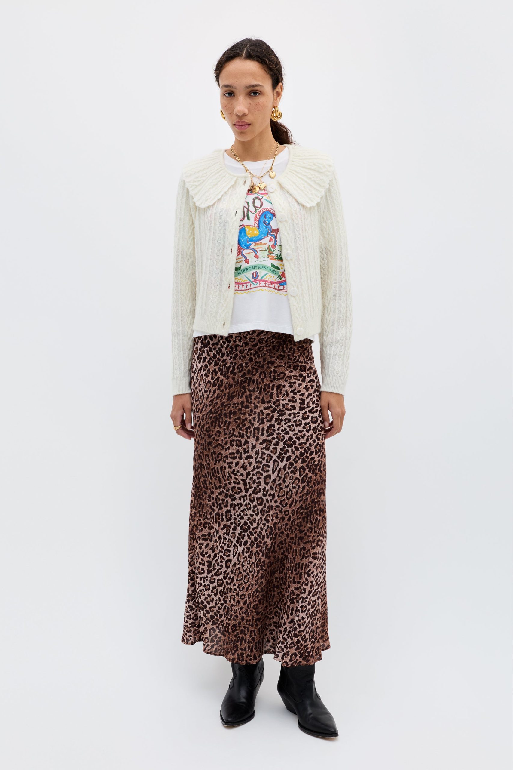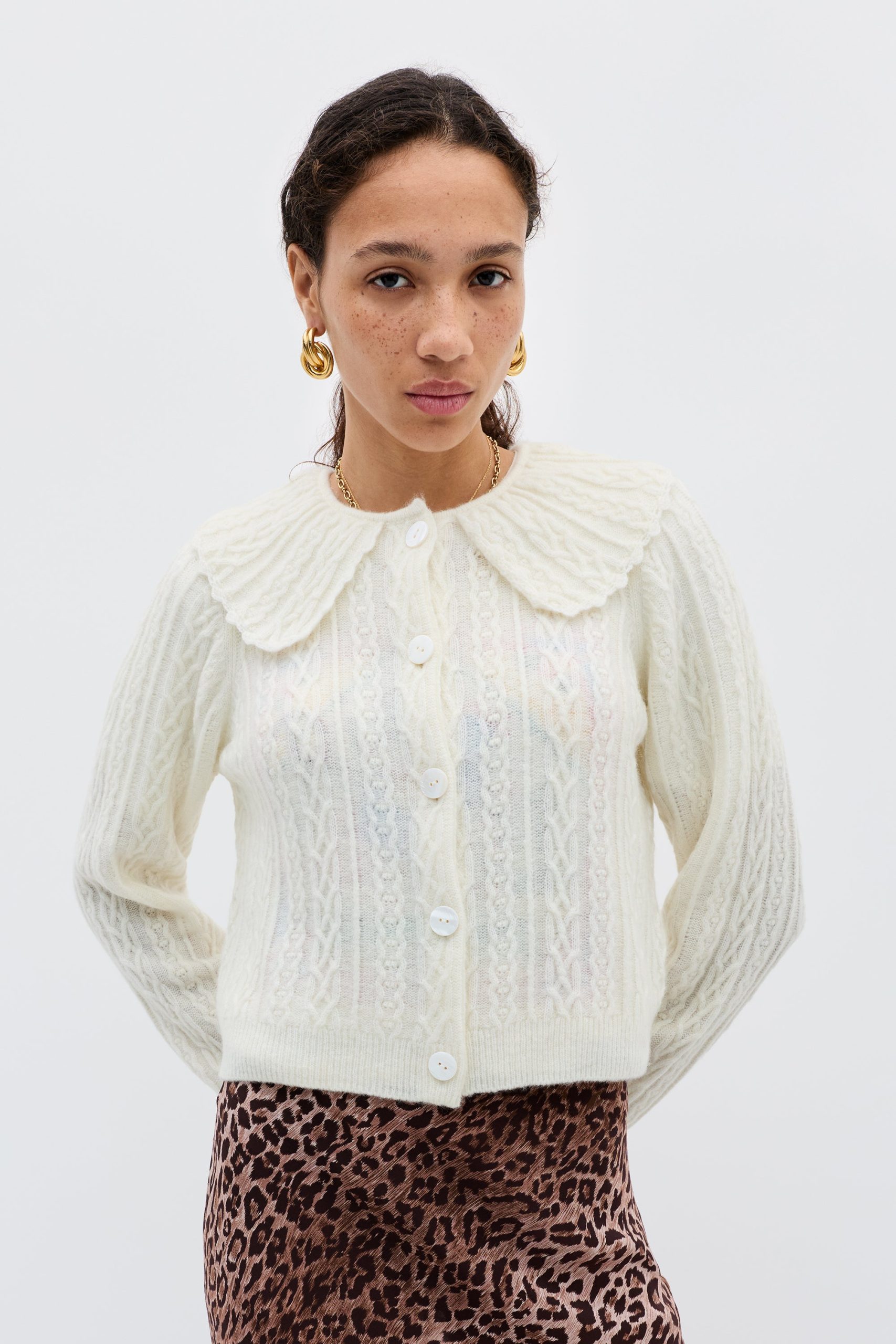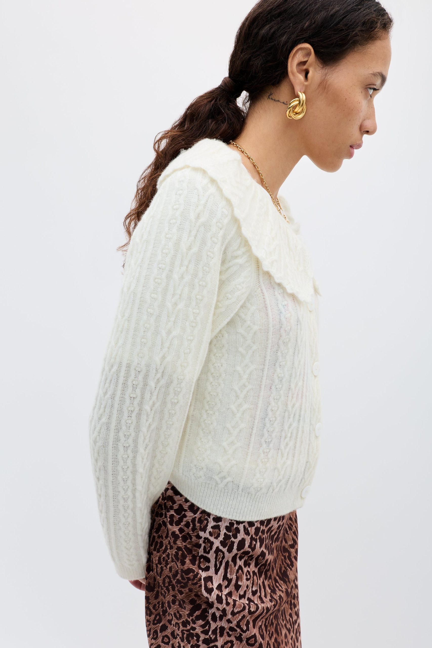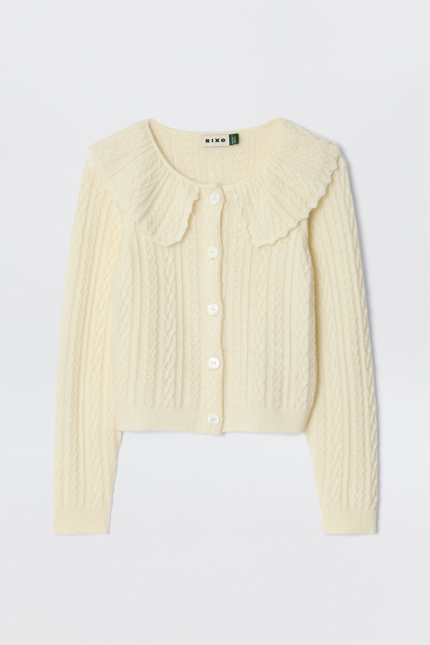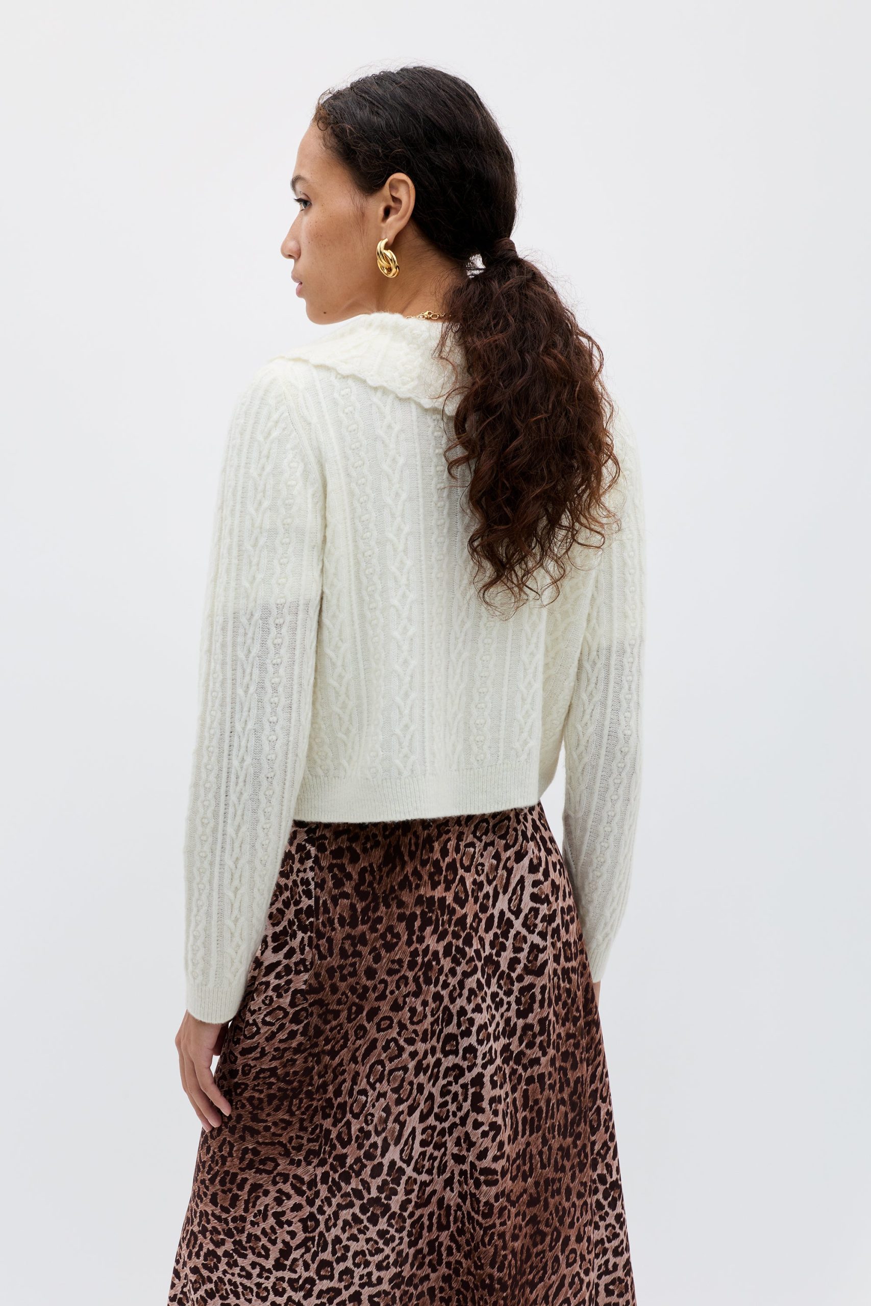 Product detailsDetailsOur favourite dressed-up cardigan now in a new cosy, cable knitperfect for transitional dressing. A classic style, with a versatile cropped hem and sleeves, that styles beautifully with high waisted skirts and over dresses. It’s the ultimate soft layer for Sunday trips to the flower market.Fit