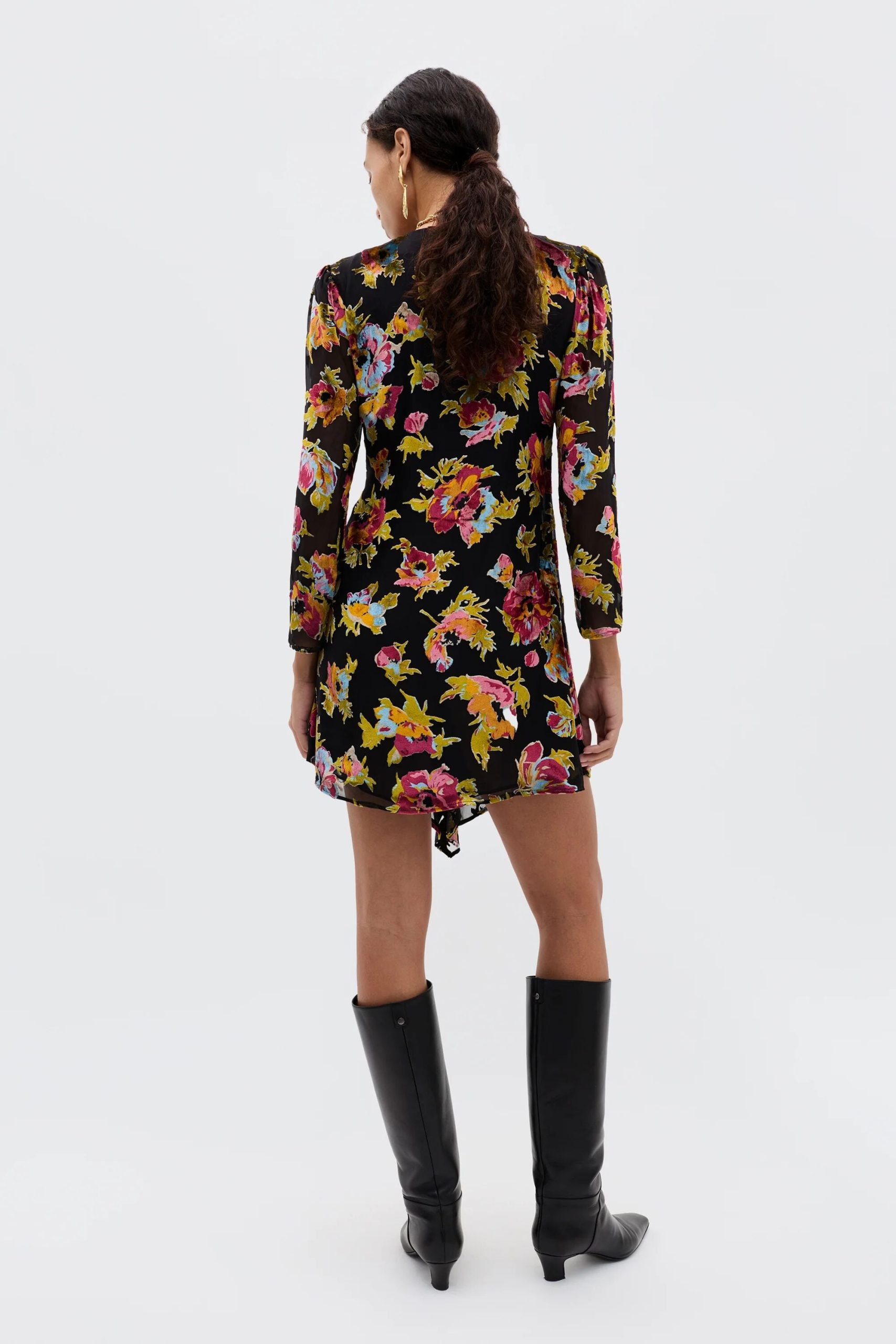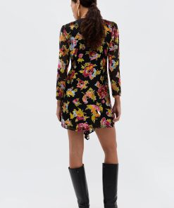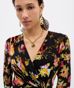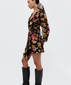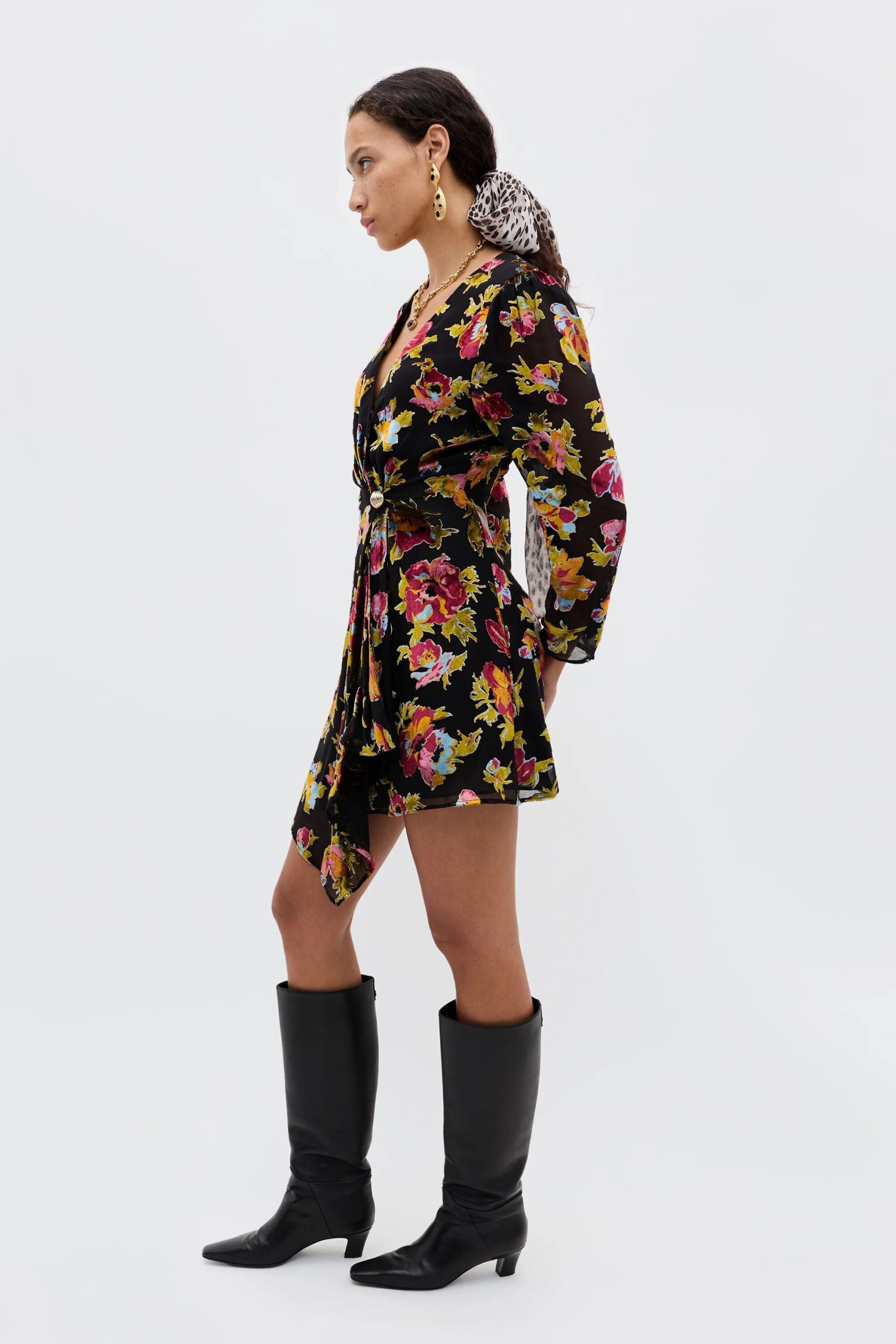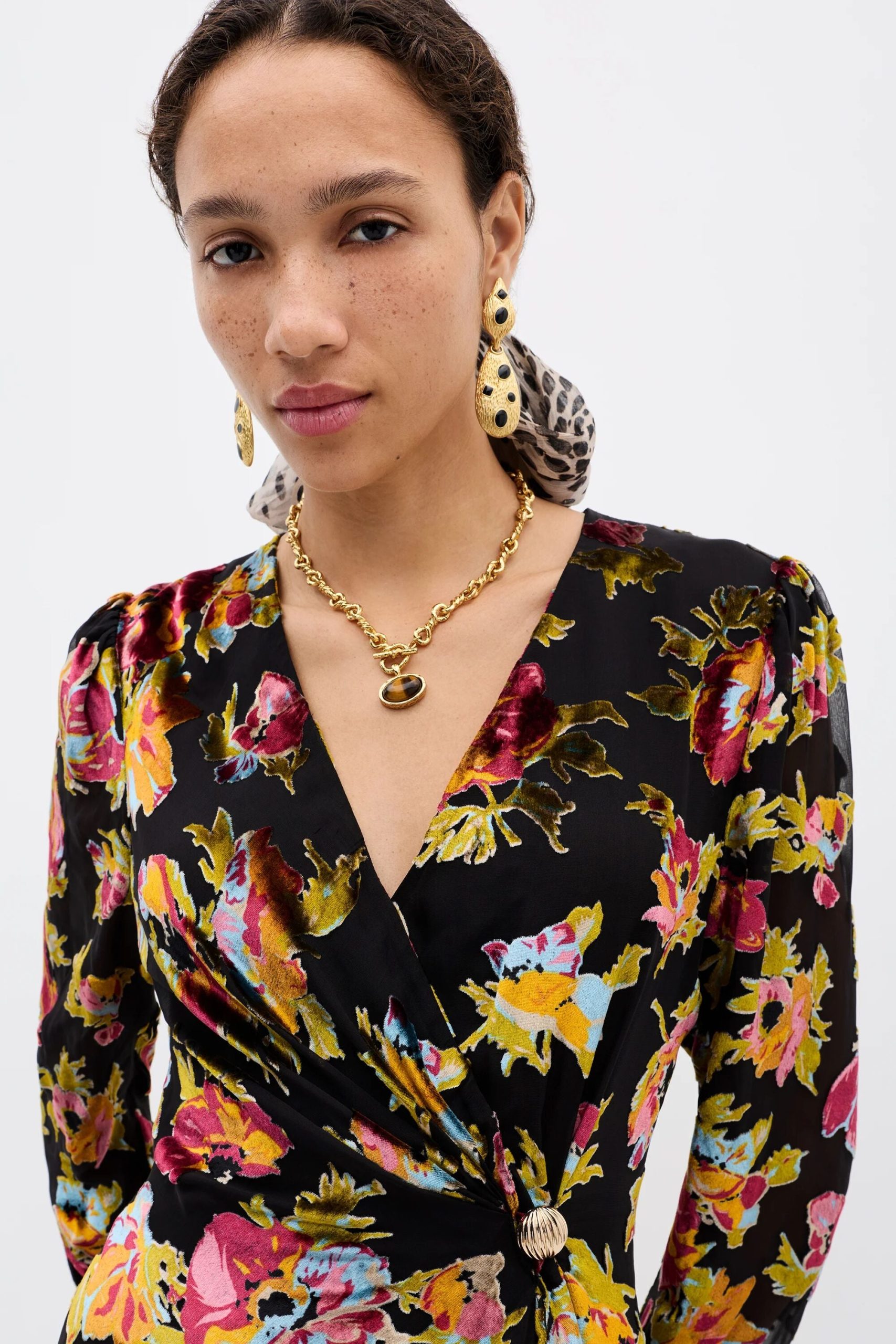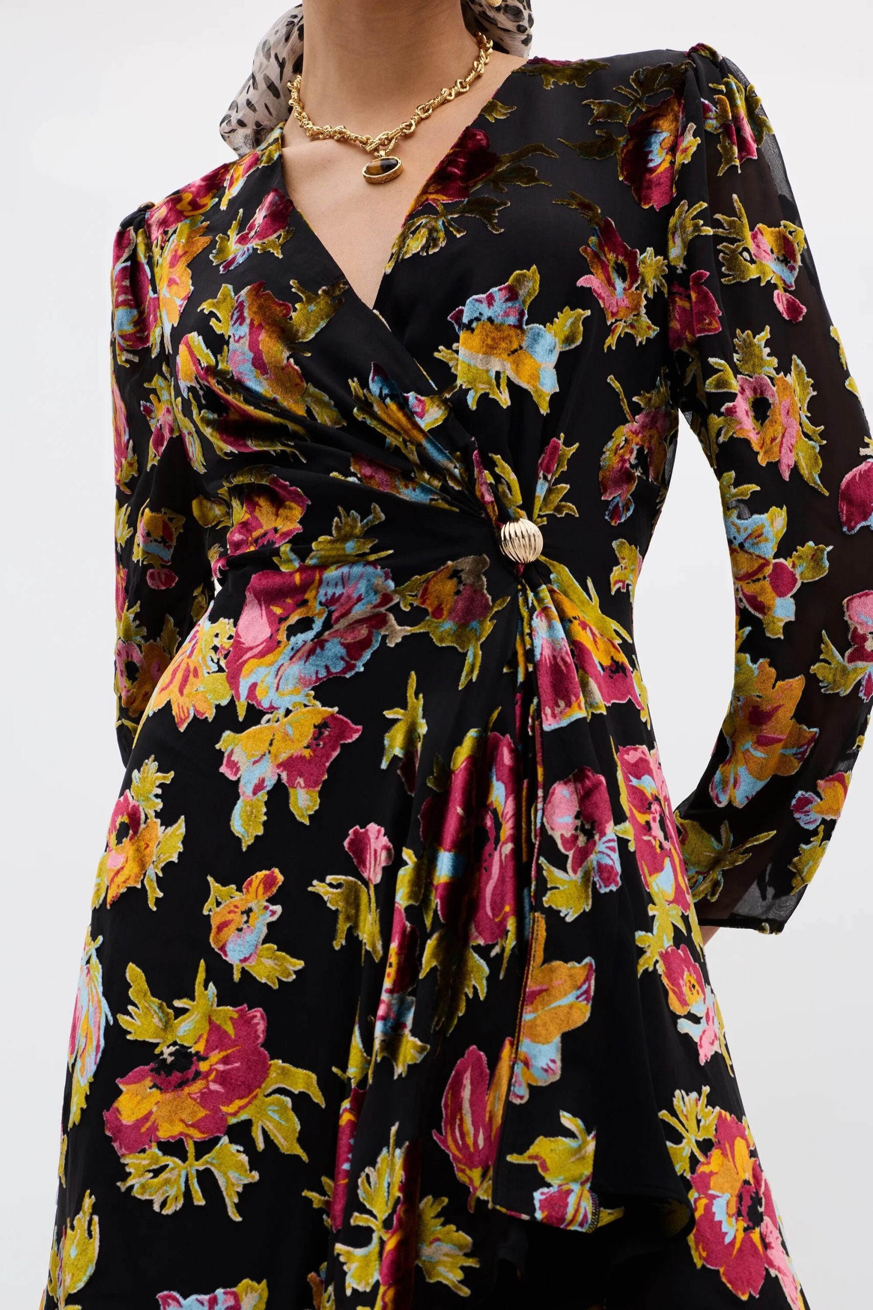Product detailsDetailsIntroducing the Kensley Dress: Short, sweet and a little bit sexy. The beautiful wrap around fit is finished with an antique-inspired gold button and the hem is asymmetrica playful nod to the vibrant spirit of the ’80s. Crafted from a bright Devoré print but with black as the base colour, there’s a refined maximalism to this style making it the ultimate cocktail dress.Fit