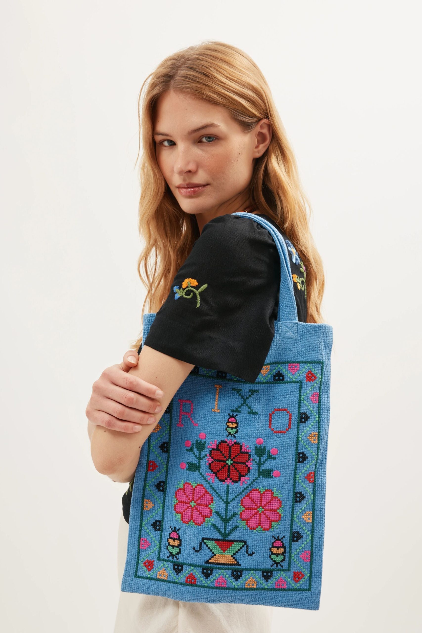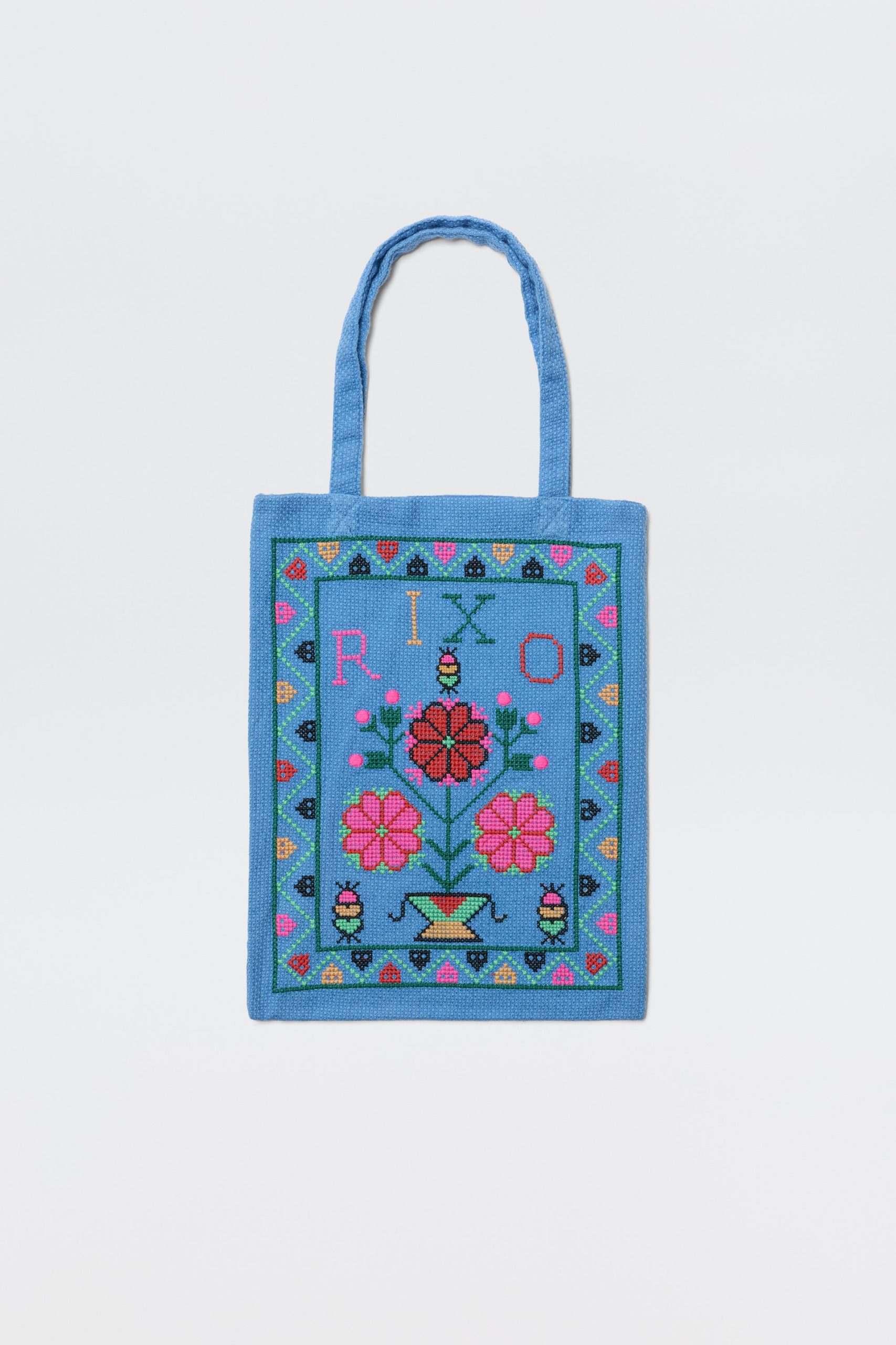Rixo Women’s Noora Cotton Bag | Terra Cross Stitch Embroidery Blue