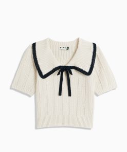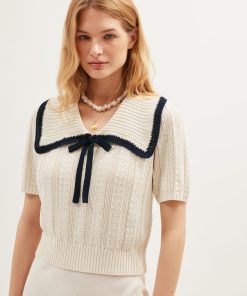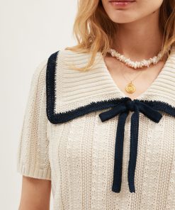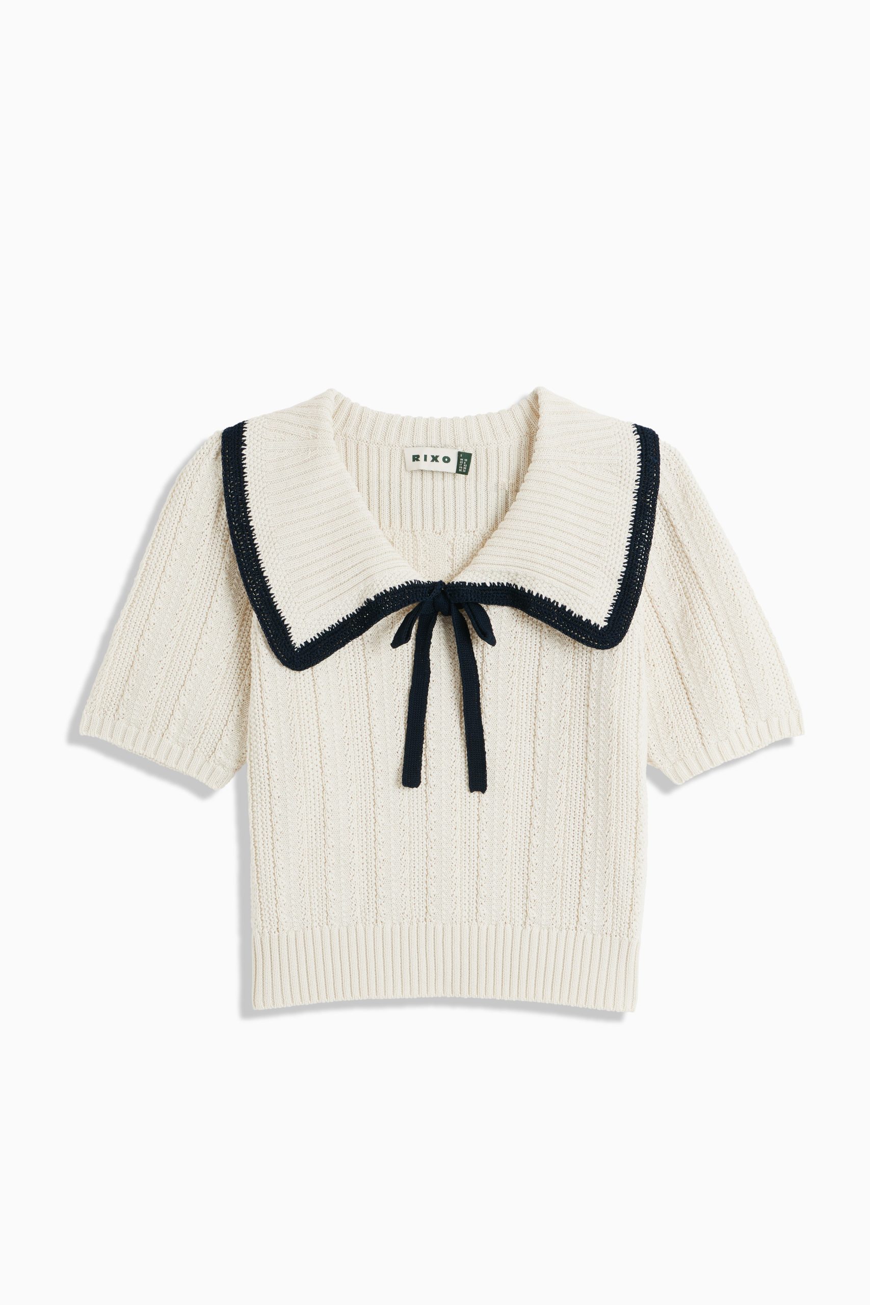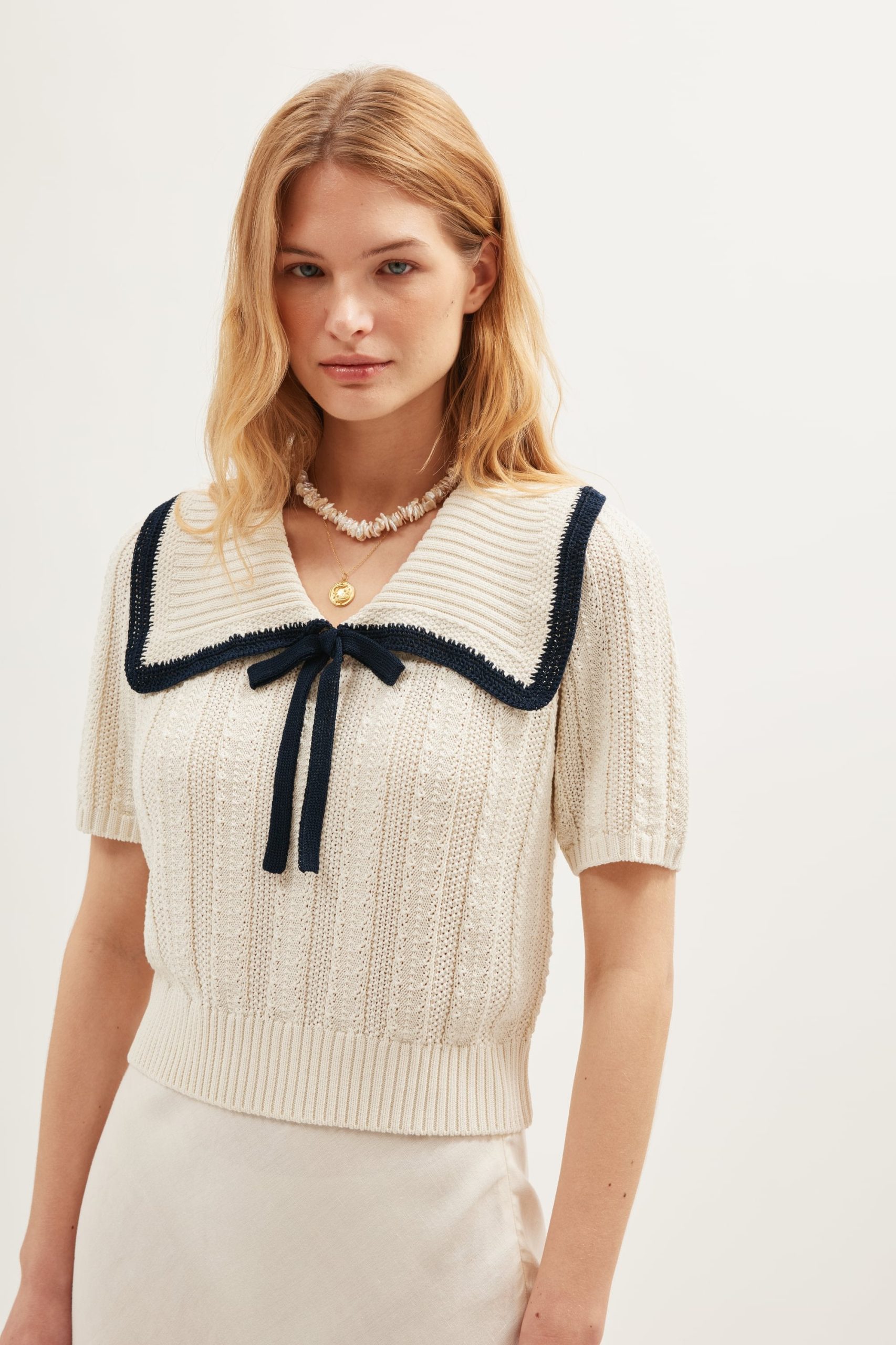 Product detailsDetailsThis Pippa top is the perfect summer nautical knit. The collar detail is inspired by a vintage style we loved – we added a bow and short, puffed sleeves.Fit
