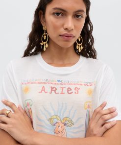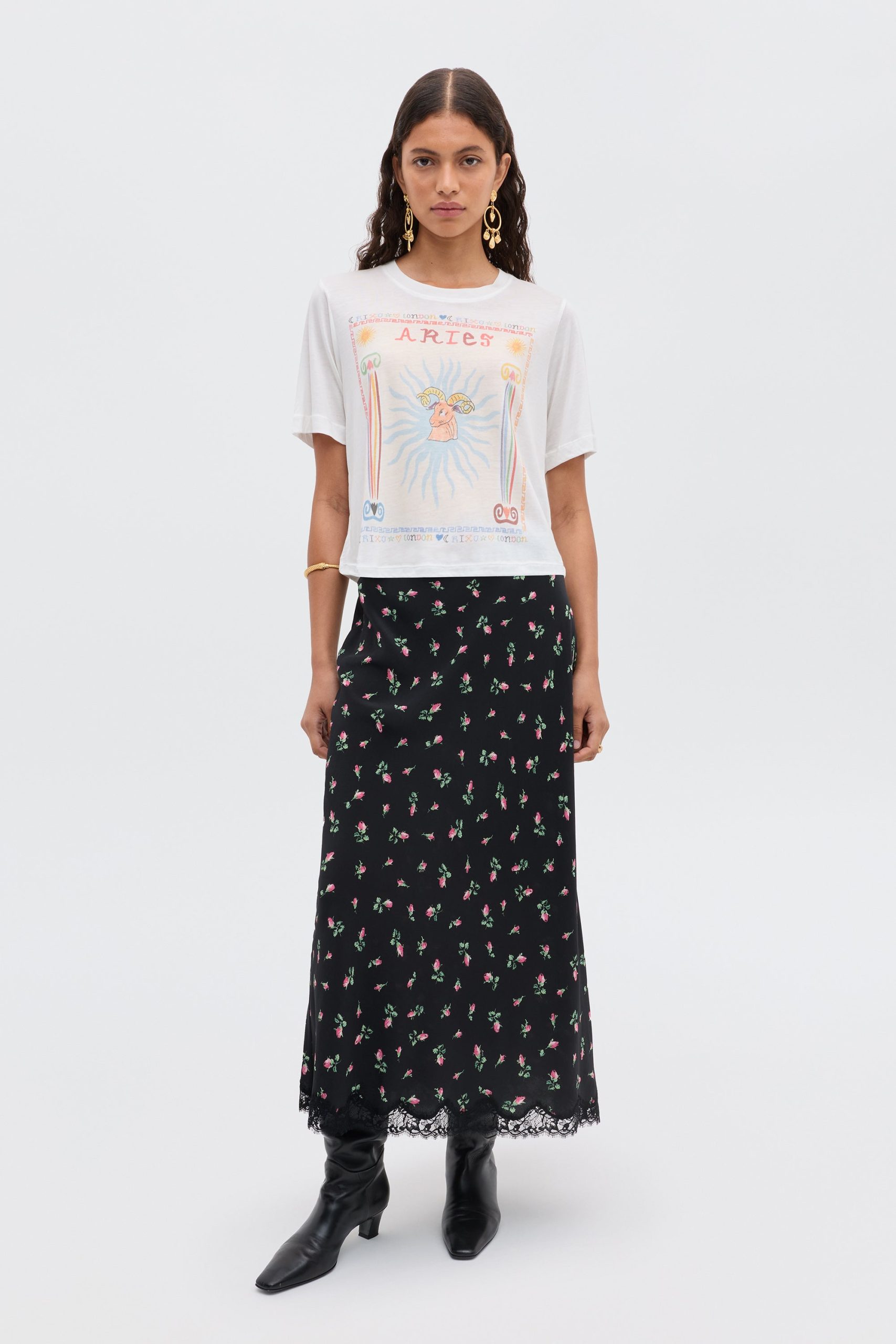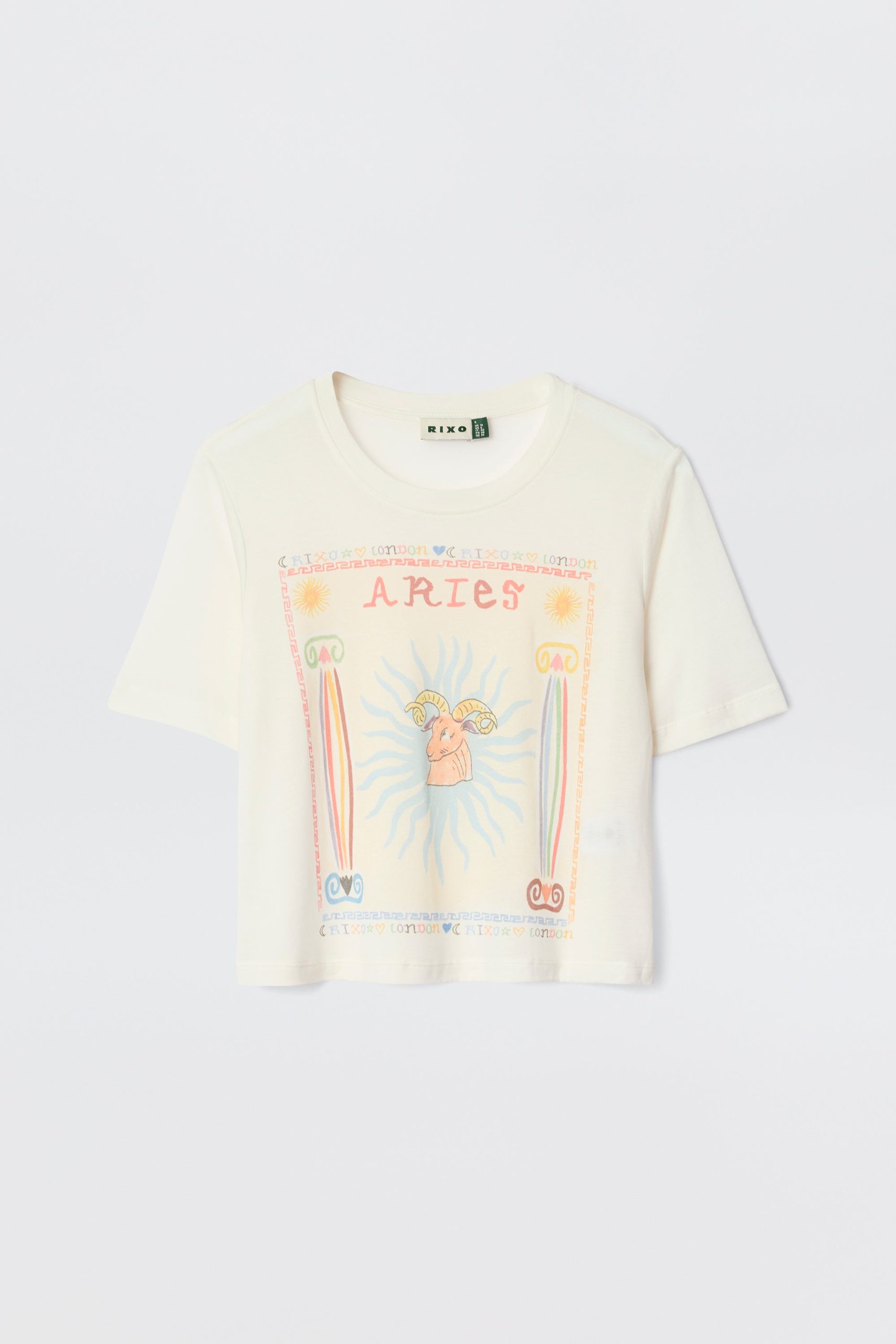 Product detailsDetailsOur Co-founder, Orlagh, sketched this Aries illustration by hand so each Ria T-shirt is unique. It’s made from slightly sheer jersey with a cropped hem that’s easy to tuck into your favourite RIXO skirts.Fit