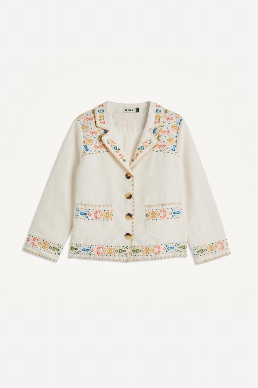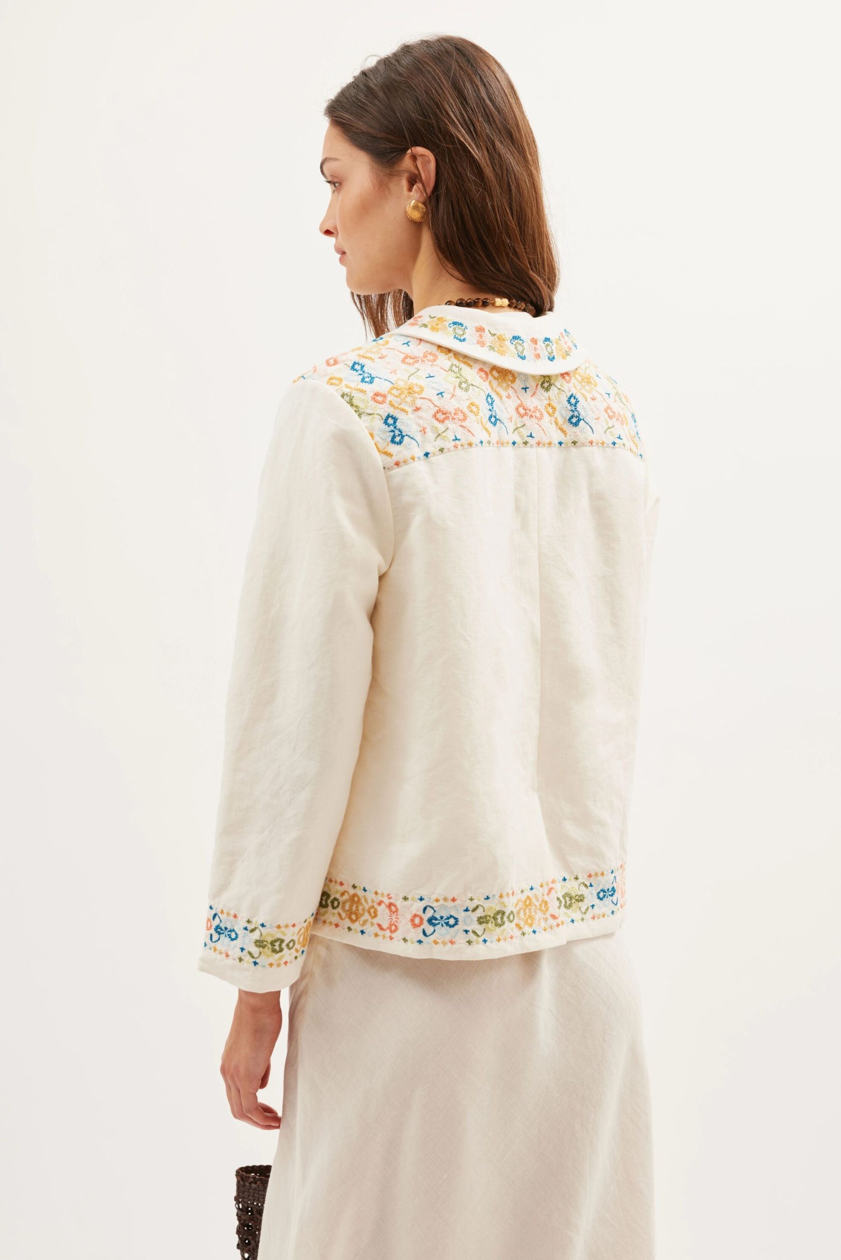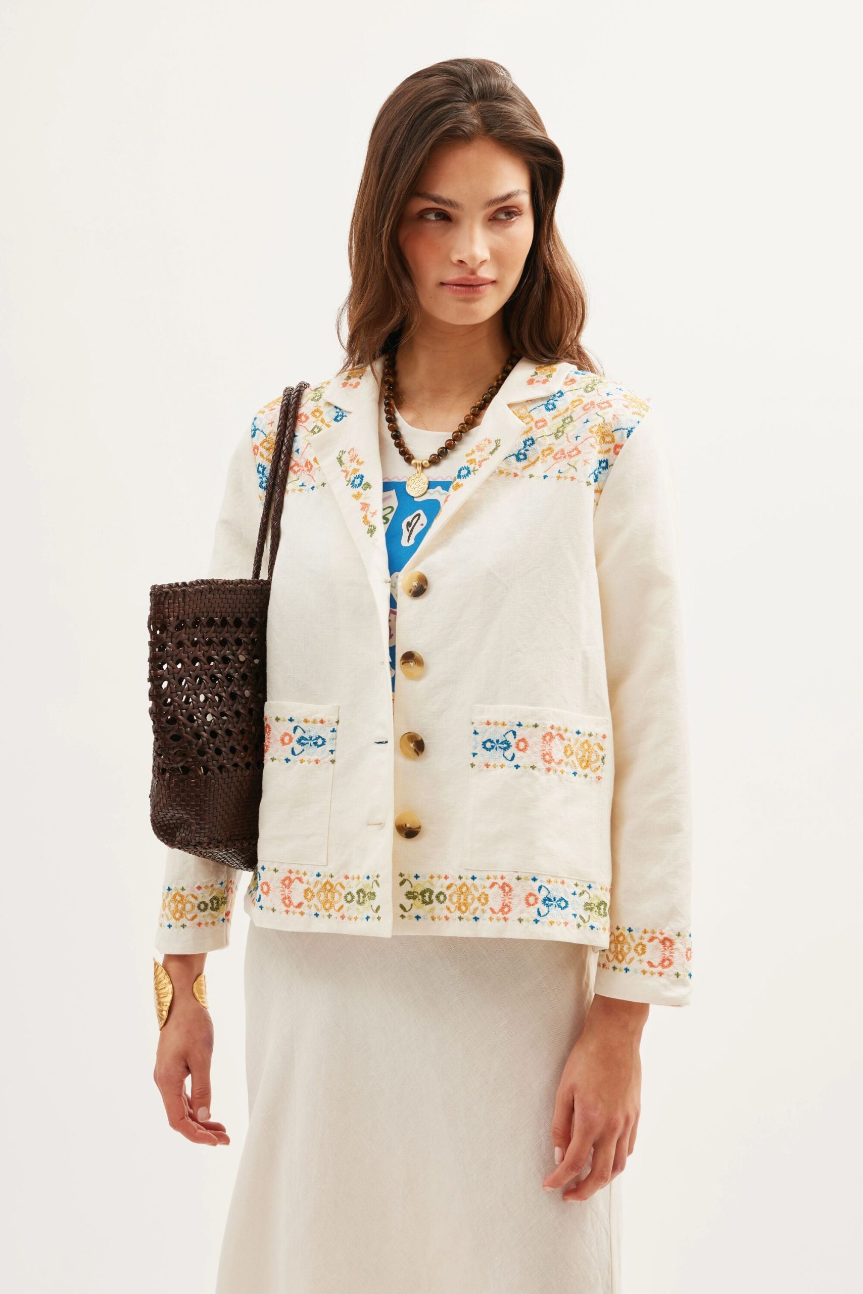 Product detailsDetailsThis Taya jacket is made from a new linen cotton-canvas fabric – it’s perfect for the warmer months and has a natural texture to it. It’s detailed with intricate cross-stitch embroidery and neat blanket-stitched edges.Fit