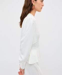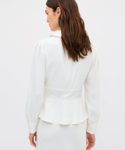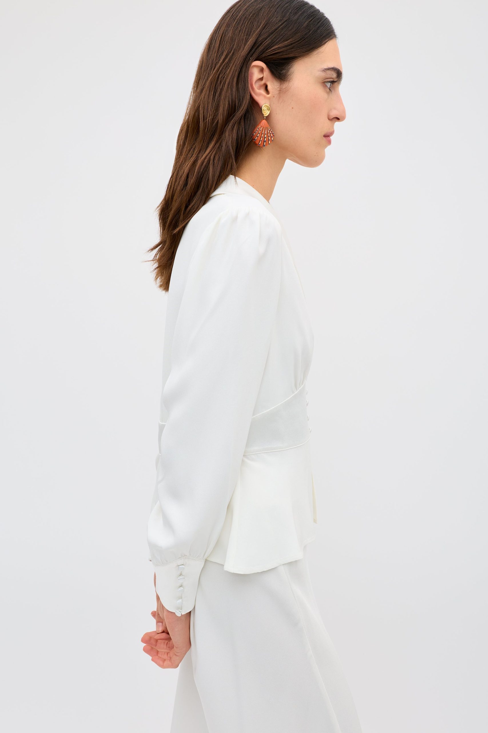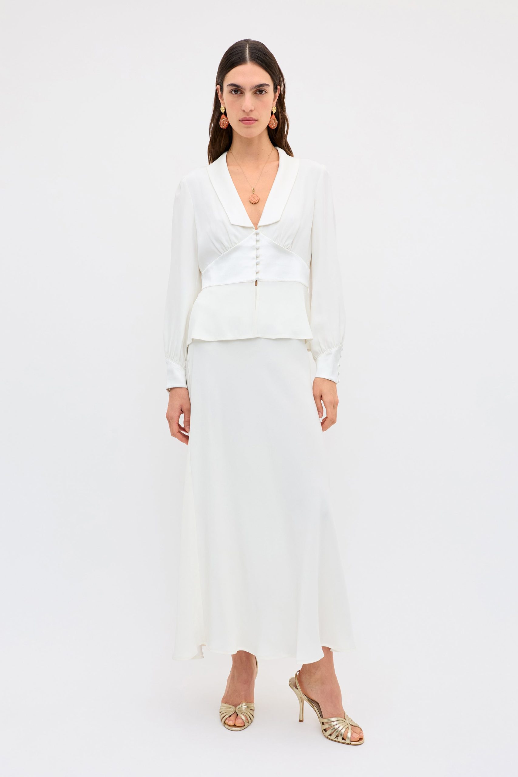 Product detailsDetailsAdeline is one of our most flattering bridal tops. It’s made from ivory silk-crepe with a vintage-inspired waist panel, peplum and soft blouson sleeves. Notice our signature covered rouleau buttons and the lustrous satin collar. Wear it with our Joan skirt.Fit