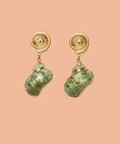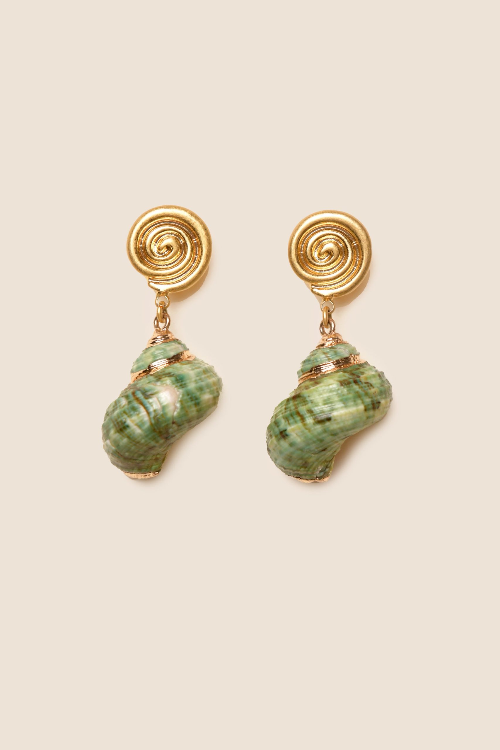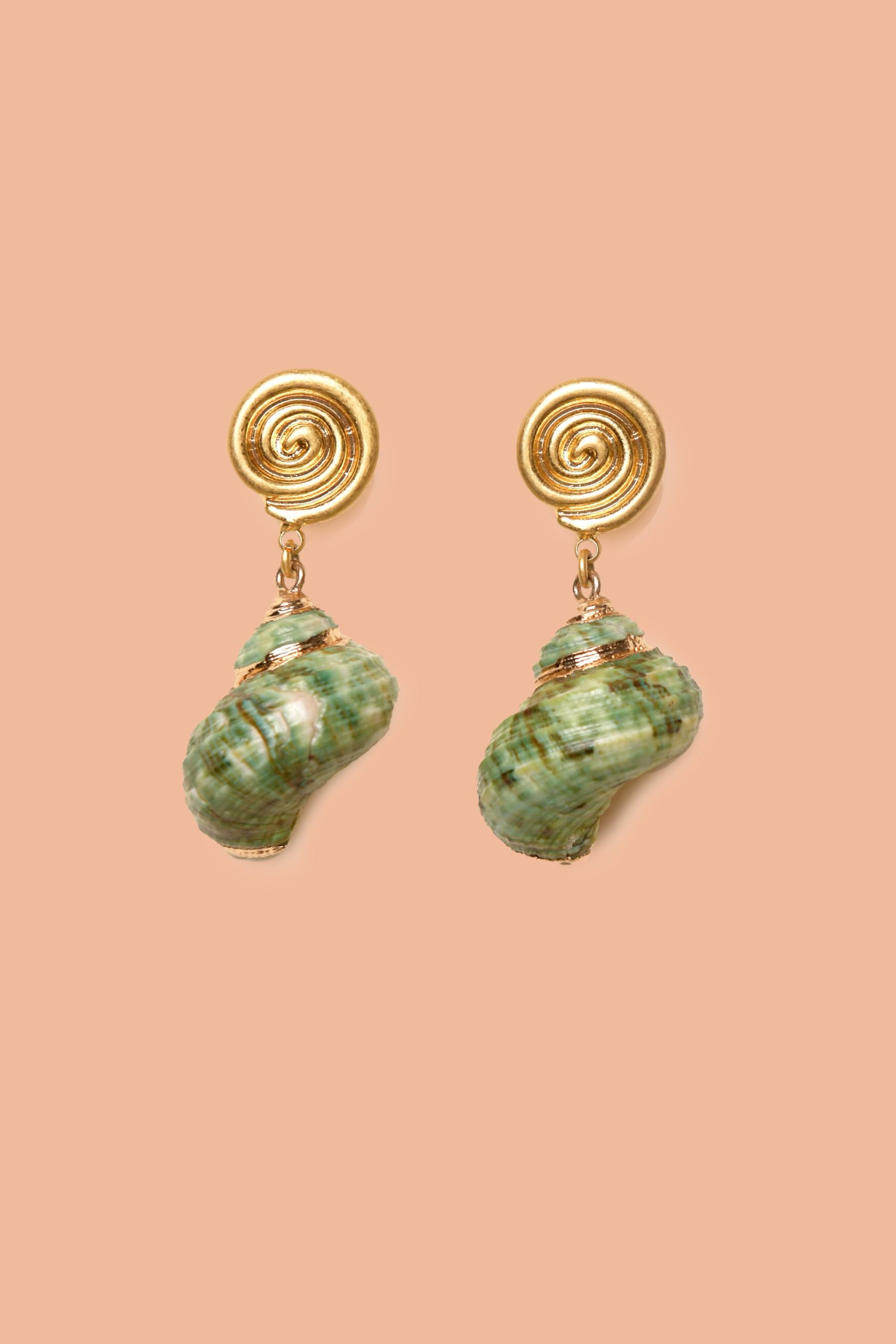 Product detailsDetailsOur Aggie earrings are strung with green shells which, despite their size, are deceptively lightweight – ideal for wearing all day. The posts are made from gold-plated metal and swirled to resemble vintage styles.Fit