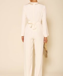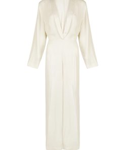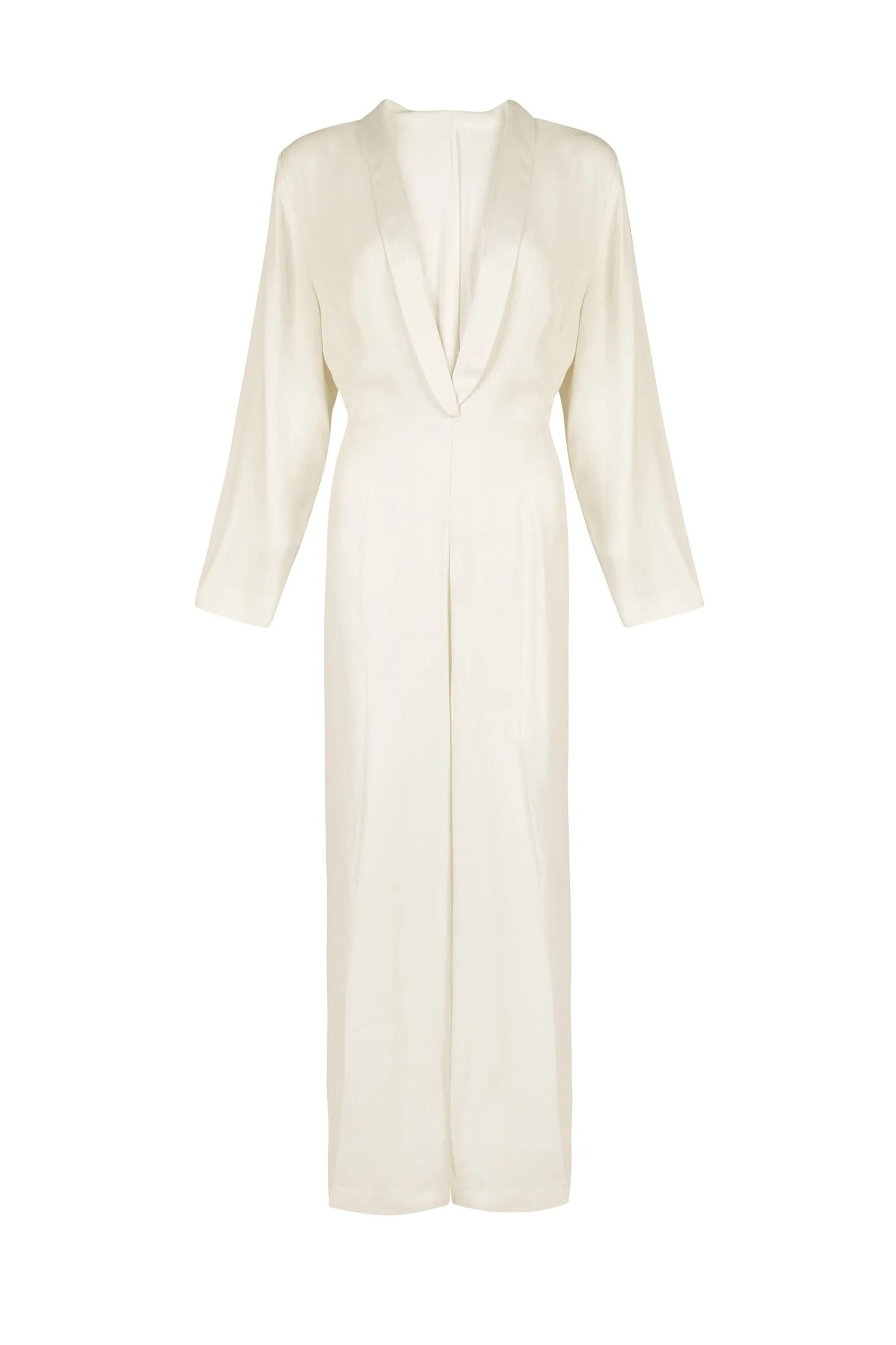 Product detailsDetailsOur Emilia jumpsuit channels Bianca Jagger and her iconic looks from the seventies. It’s tailored from smooth silk crepe de chine with sleek, wide-leg trousers and a plunging neckline that’s wrapped in silk satin to resemble a tuxedo. Carefully considered darts and gathers are positioned for the most flattering fit.Fit