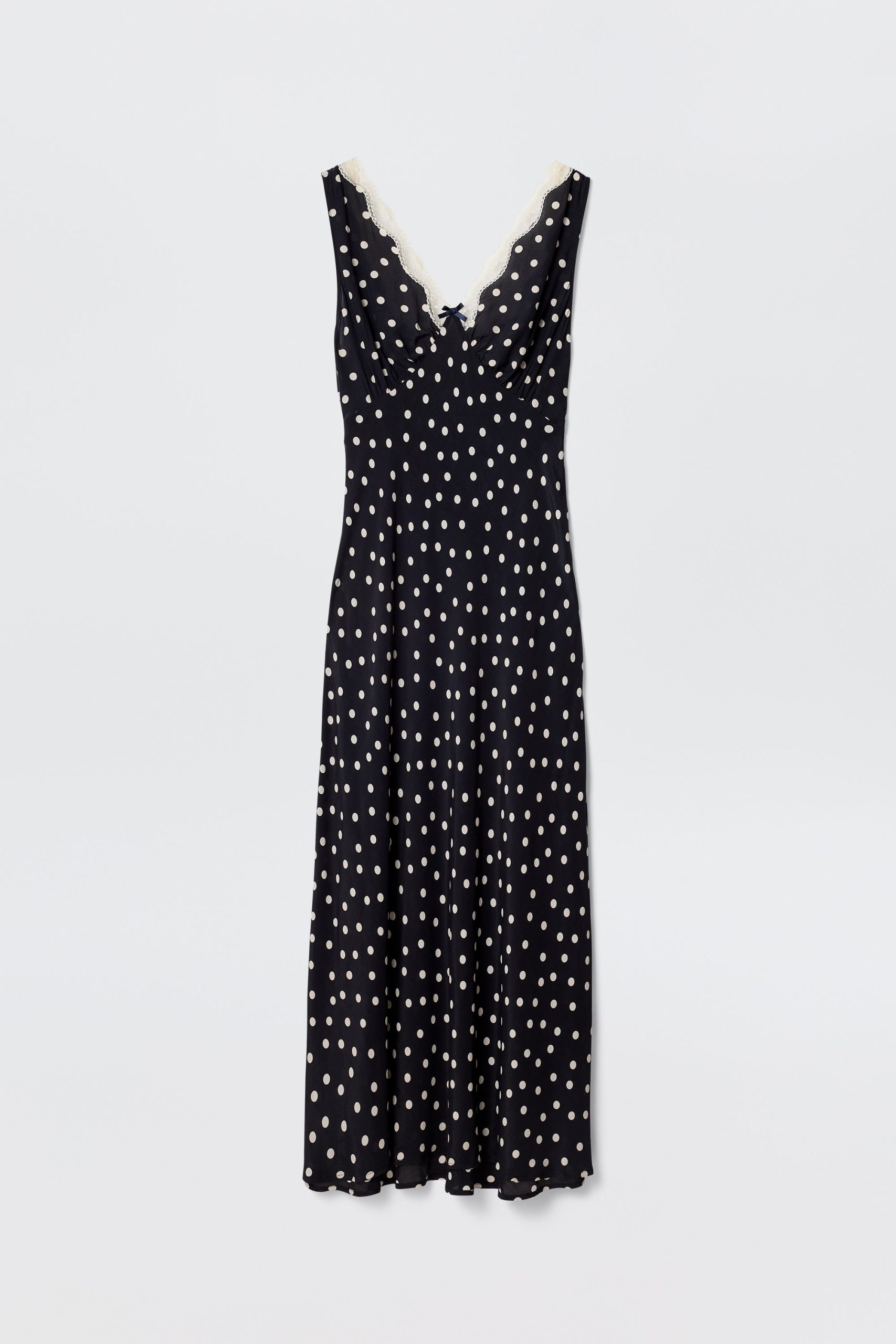 Product detailsDetailsSandrine is an iconic RIXO dress, inspired by a bias-cut slip from the 30s and designed with a bra-friendly neckline and figure-lengthening empire waist. The polka-dot print on this crepe version is classic RIXO and also inspired by vintage.Fit