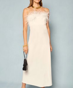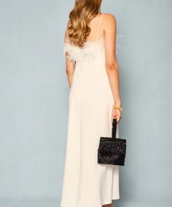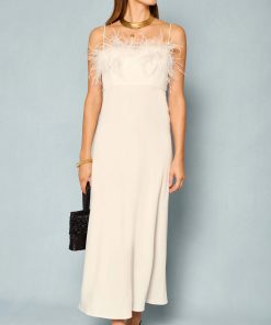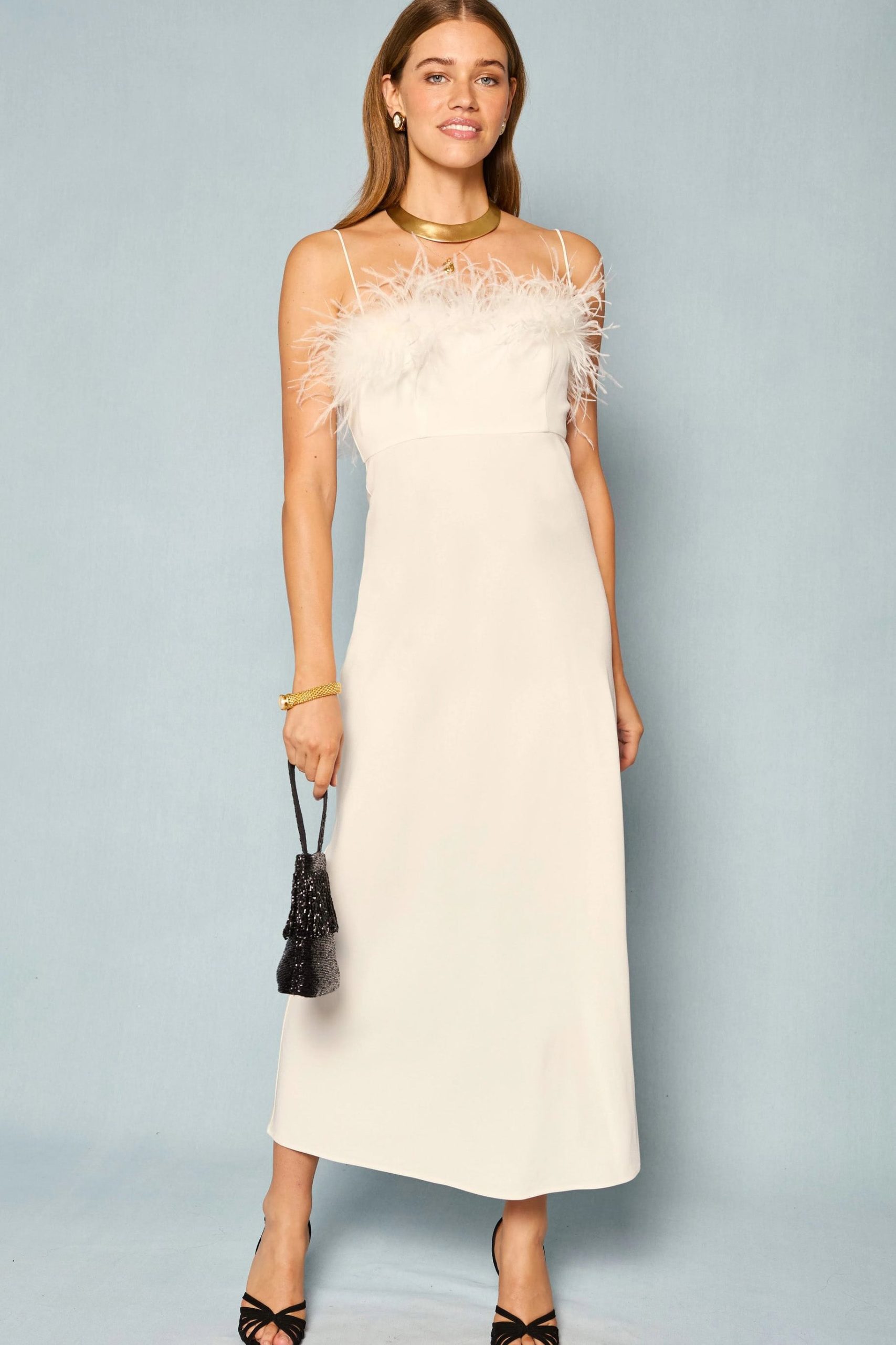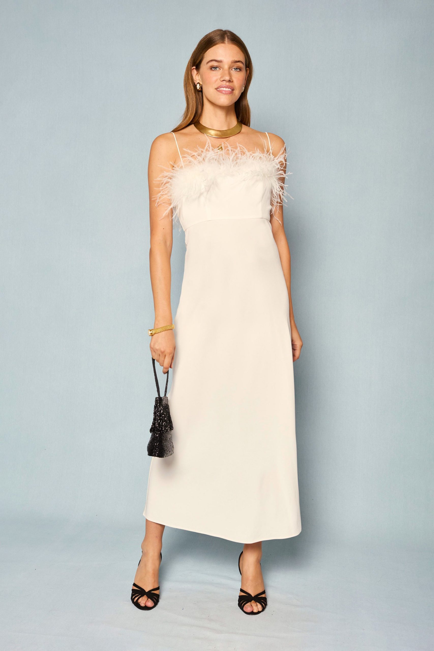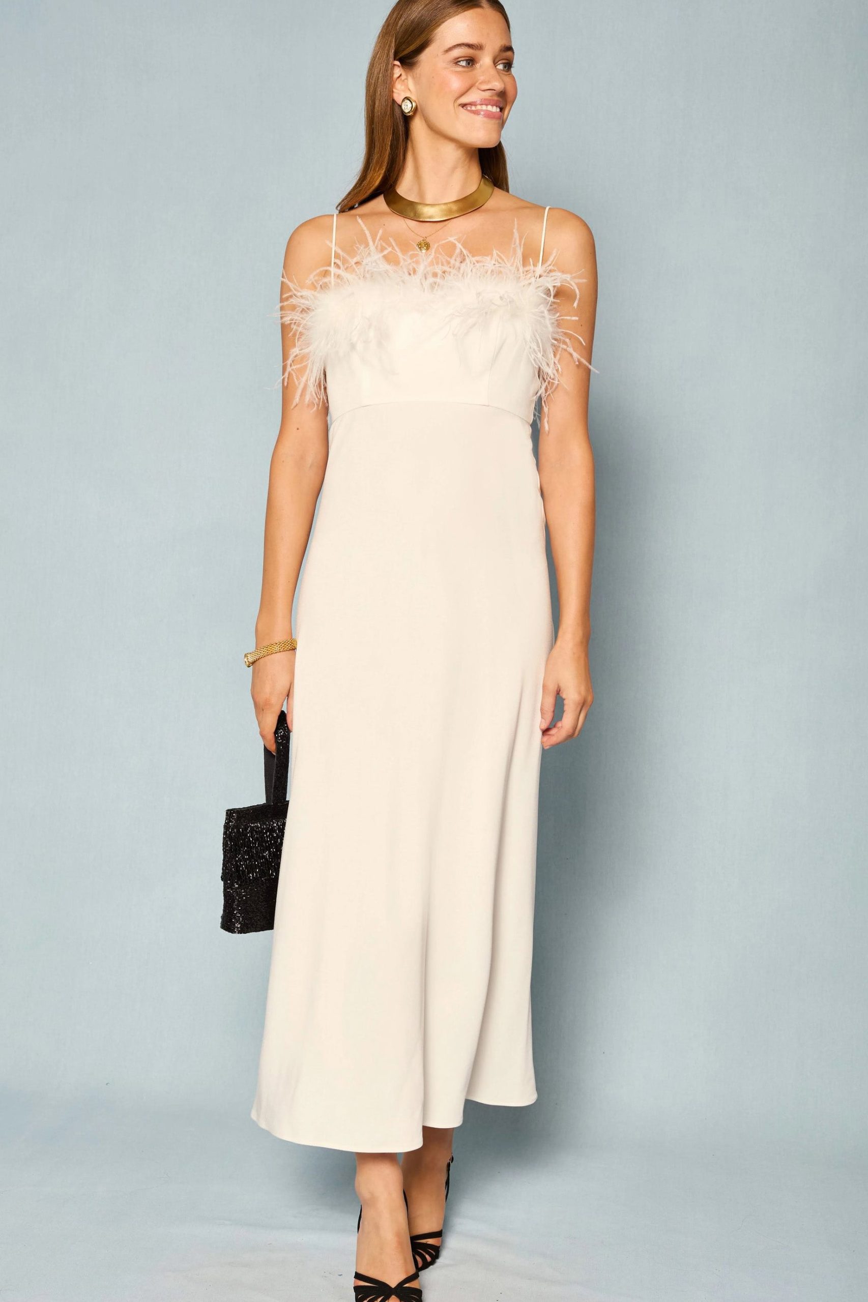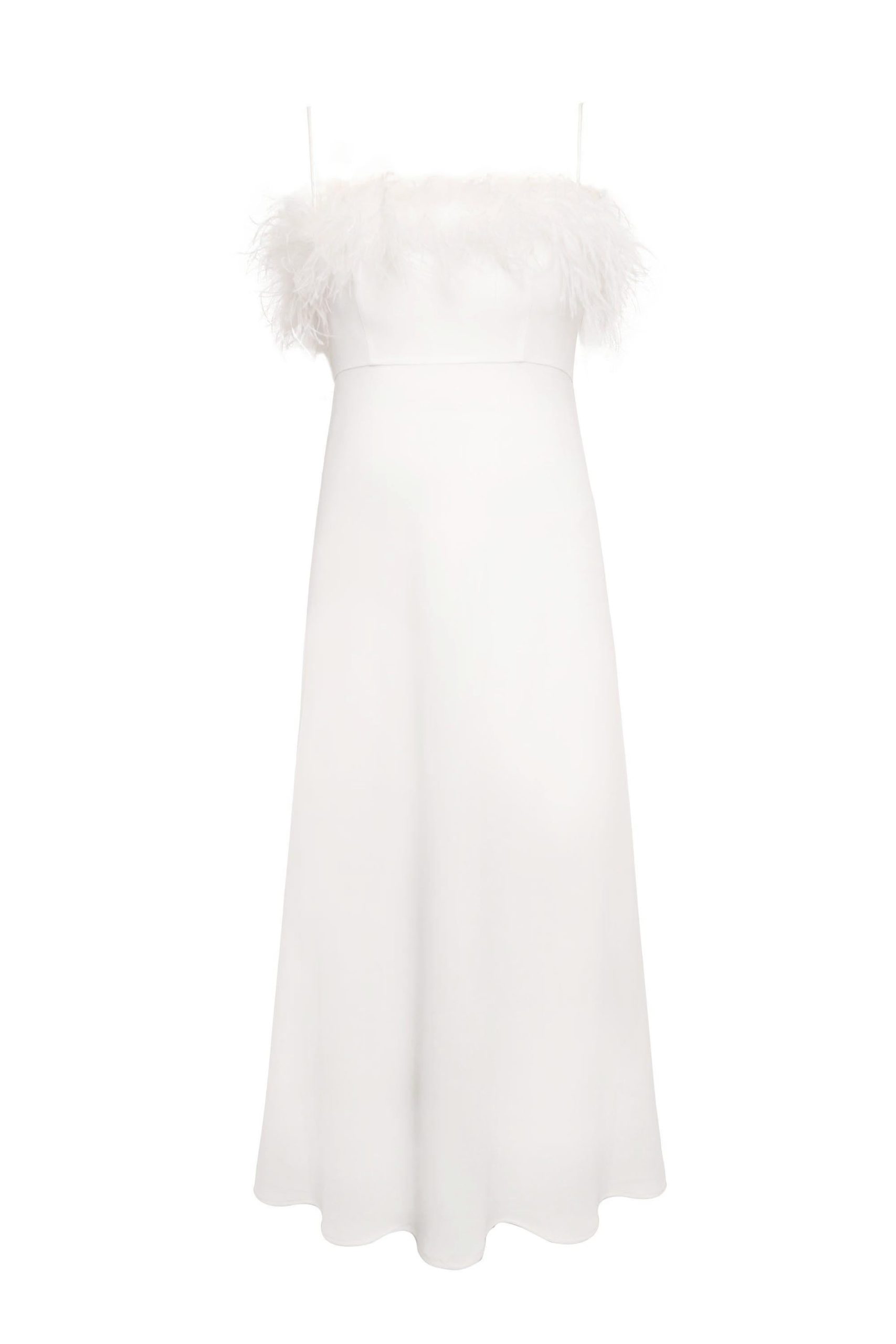 Product detailsDetailsSimple yet striking at the same time, our Selene bridal dress is made from smooth crepe for a fluid drape. The empire waist creates a nipped-in silhouette before falling to a loose, bias-cut skirt. The highlight? Of course it’s the feather-trimmed neckline.Fit