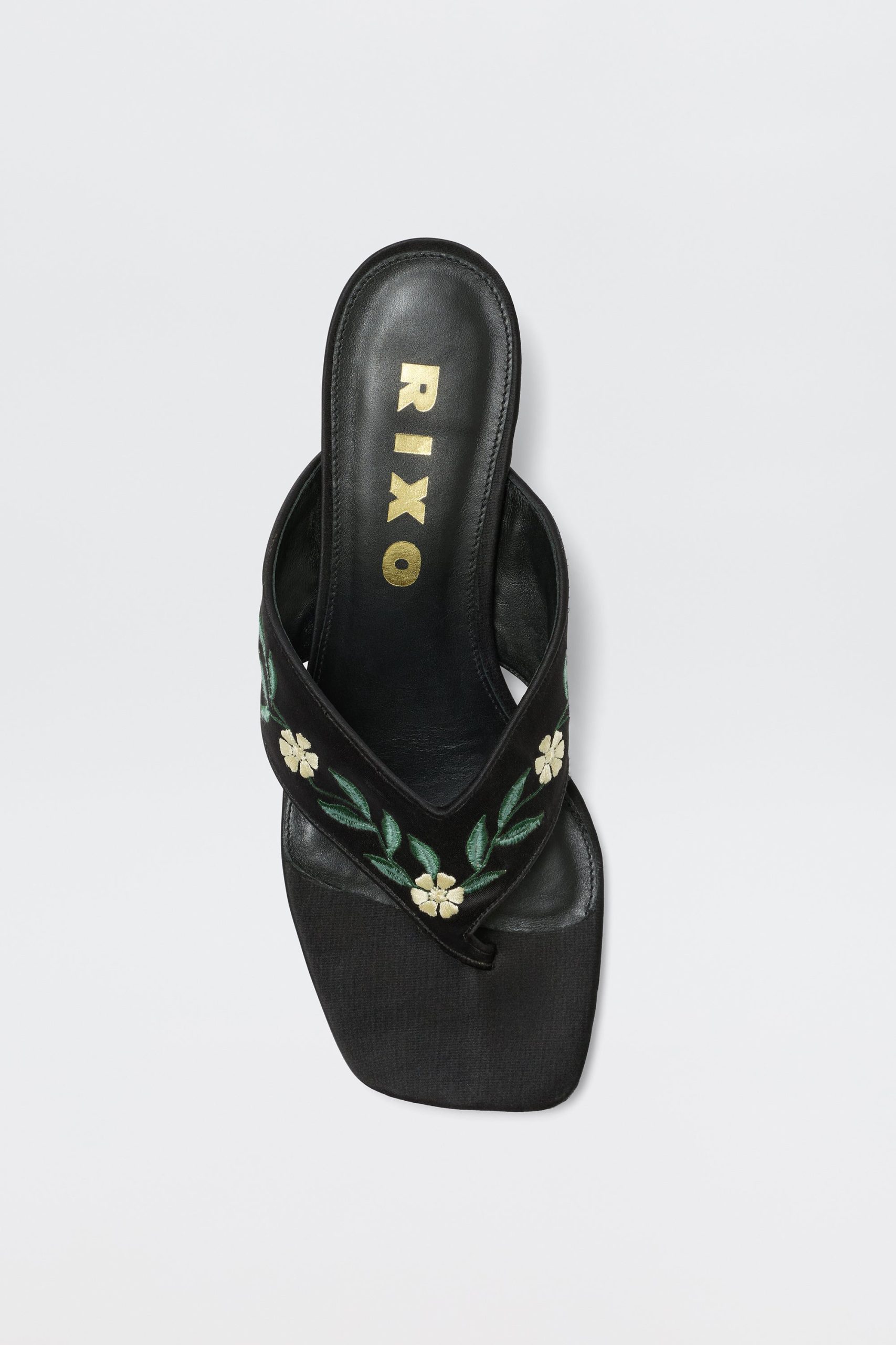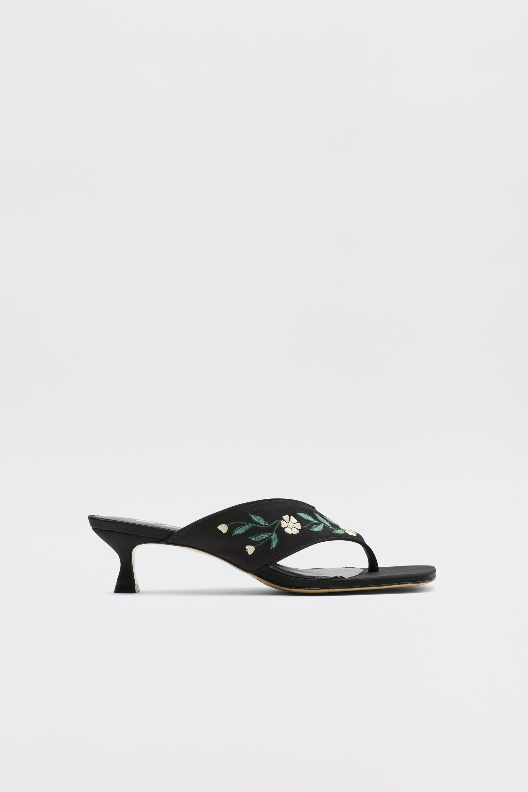 Product detailsDetailsOur Zoya sandals are based on a vintage pair we loved – they’ll add a unique feel to your occasion outfits. They’re made from soft satin and embroidered across the straps with trailing flowers. The fluted heel and wide straps are so comfortable.Fit